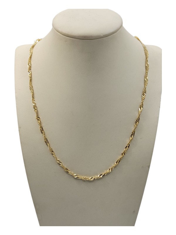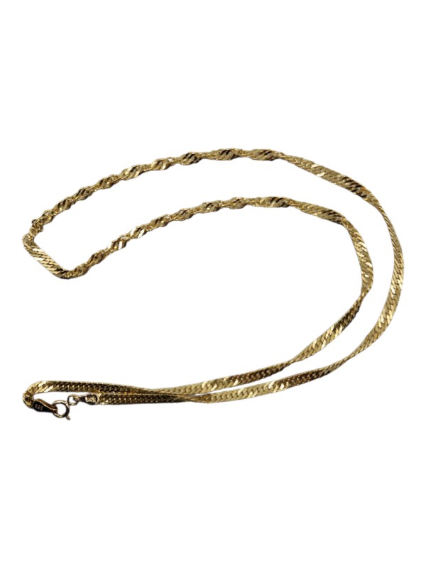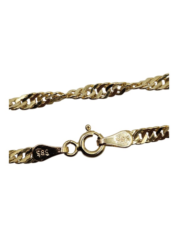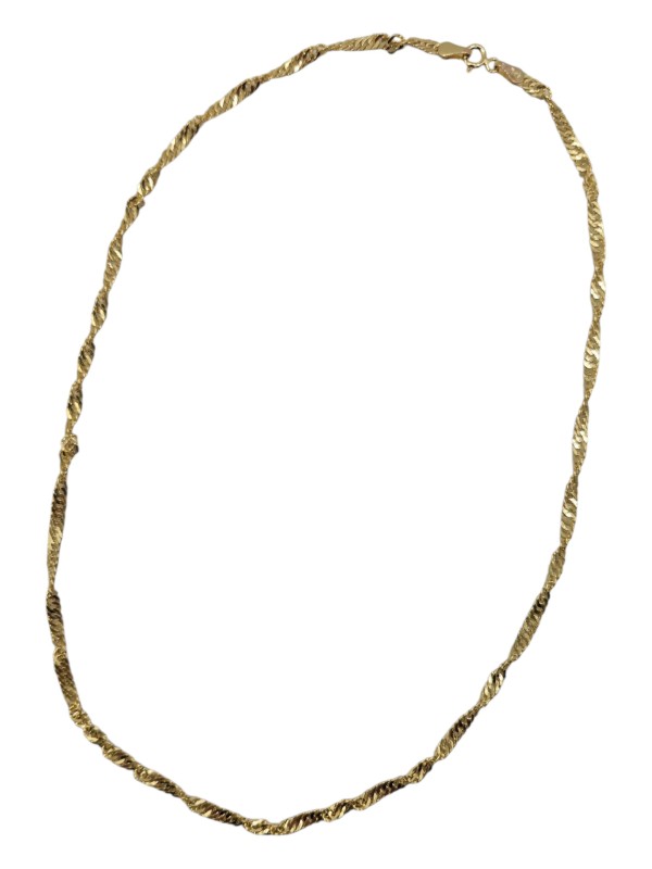 This elegant 14CT yellow gold twisted style necklace exudes timeless sophistication. Crafted with a hallmark of .585, it weighs a delicate 2.91g and measures 22cm in length. The distinctive rope-style links create a captivating, textured design that adds visual interest. A versatile accessory, this necklace is suitable for both casual and formal wear.