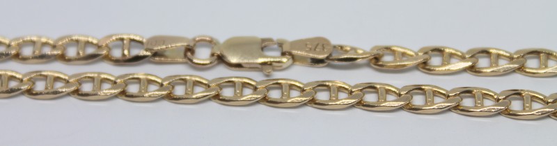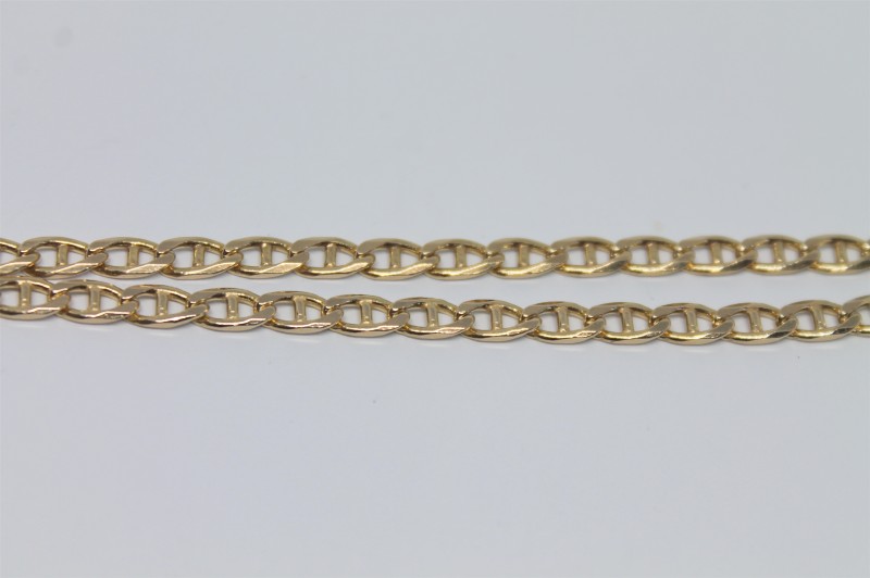 This 9ct yellow gold anchor link necklace weighs 18.79 grams and measures 72cm in length. The hallmark of .375 confirms the 9 karat purity of the yellow gold material. While the necklace is broken, it retains the classic anchor link design suitable for both men and women. All sizes and measurements are approximate.