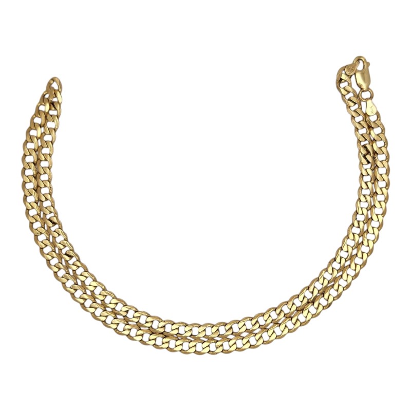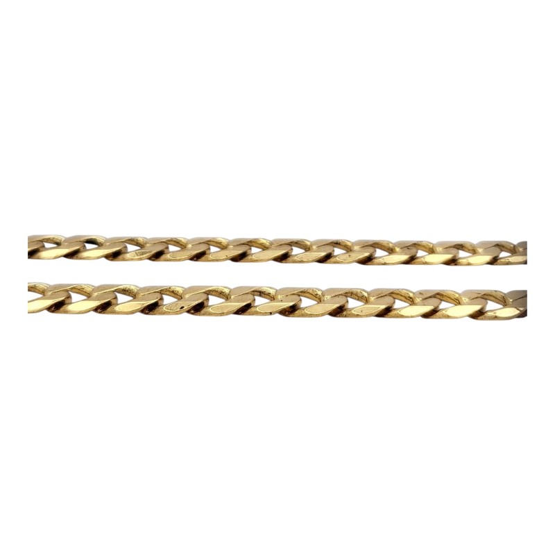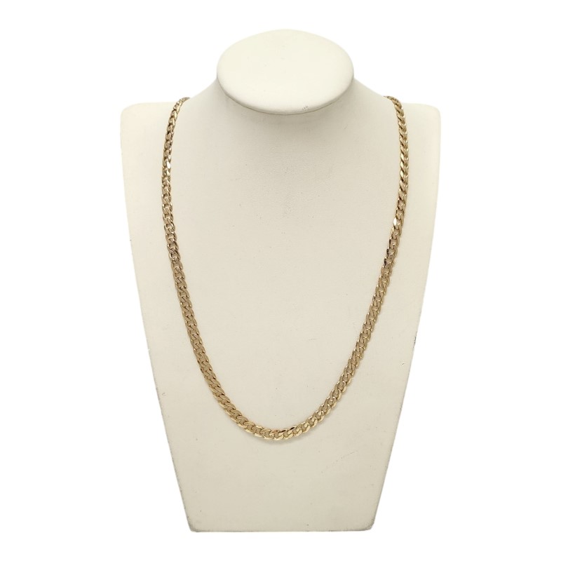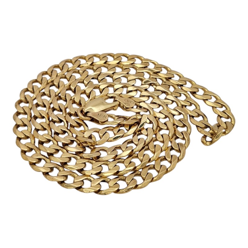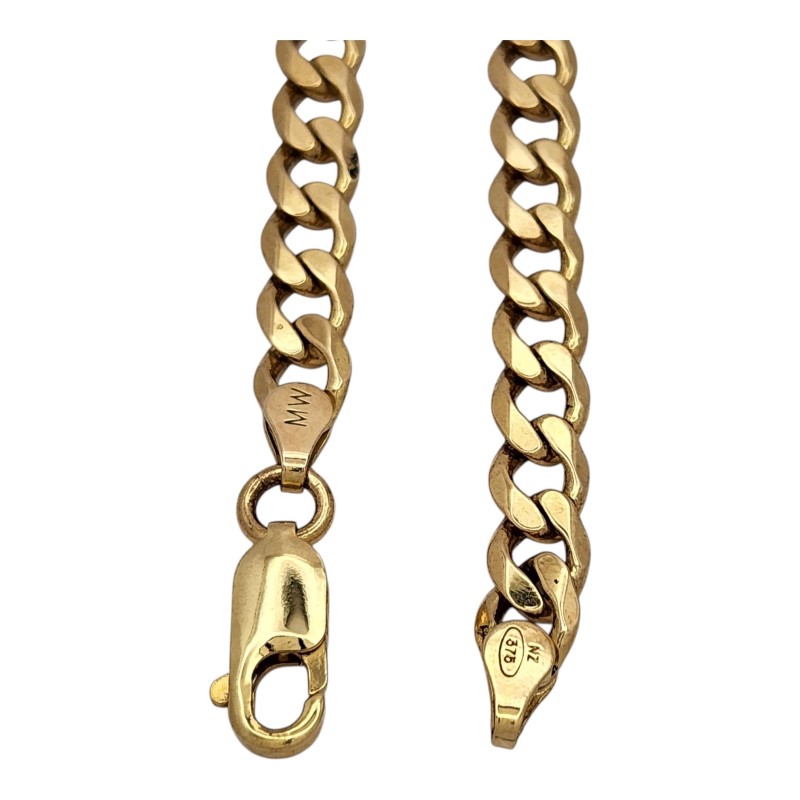 This stylish 9 Karat yellow gold necklace is a versatile accessory suitable for any occasion. Crafted with a classic chain design, the necklace measures 56 cm in length and weighs a substantial 25.48 grams. The hallmark of .375 ensures the quality and purity of the precious metal. The engraved initials "NZ MW" add a personalized touch to this timeless menswear piece. All sizes and measurements are approximate.