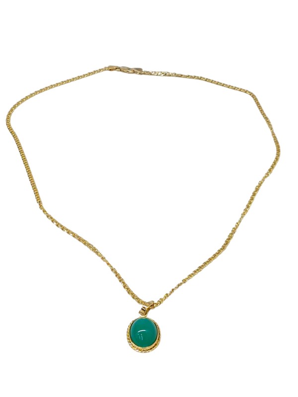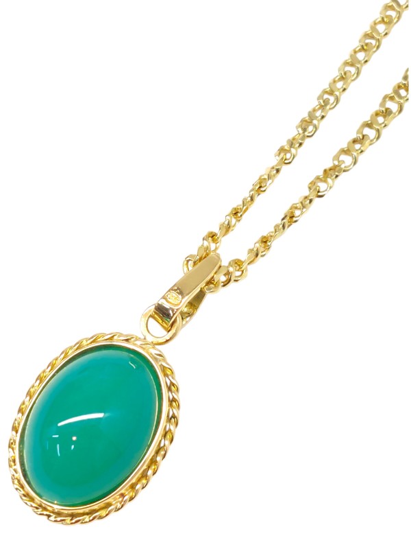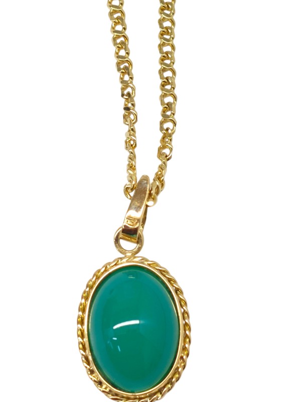 This stunning 18K yellow gold necklace features a captivating oval-shaped pendant. The pendant showcases a vibrant dyed chalcedony stone, adding a pop of colour to this elegant piece. Measuring 55cm in length and weighing 18.46g, this necklace is a versatile accessory that can be dressed up or down. All sizes and measurements are approximate.