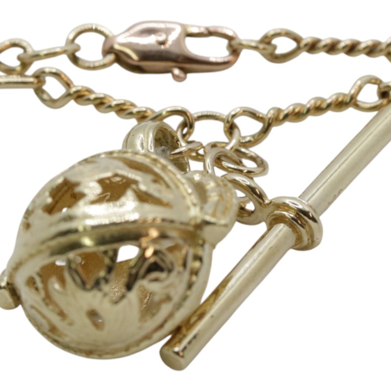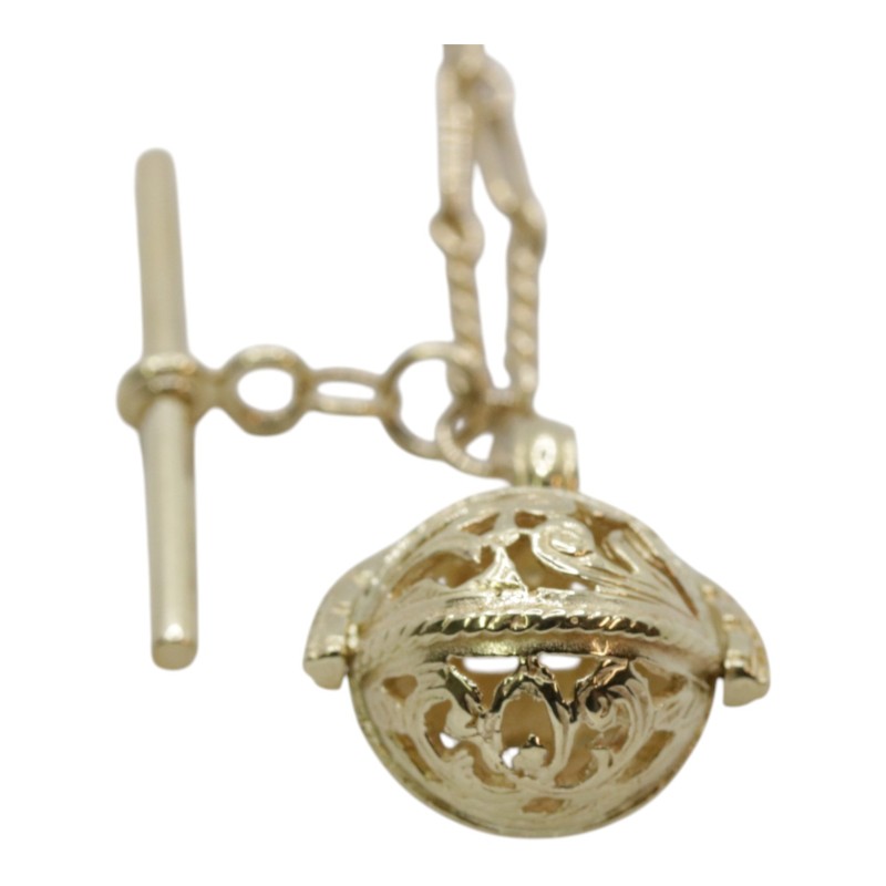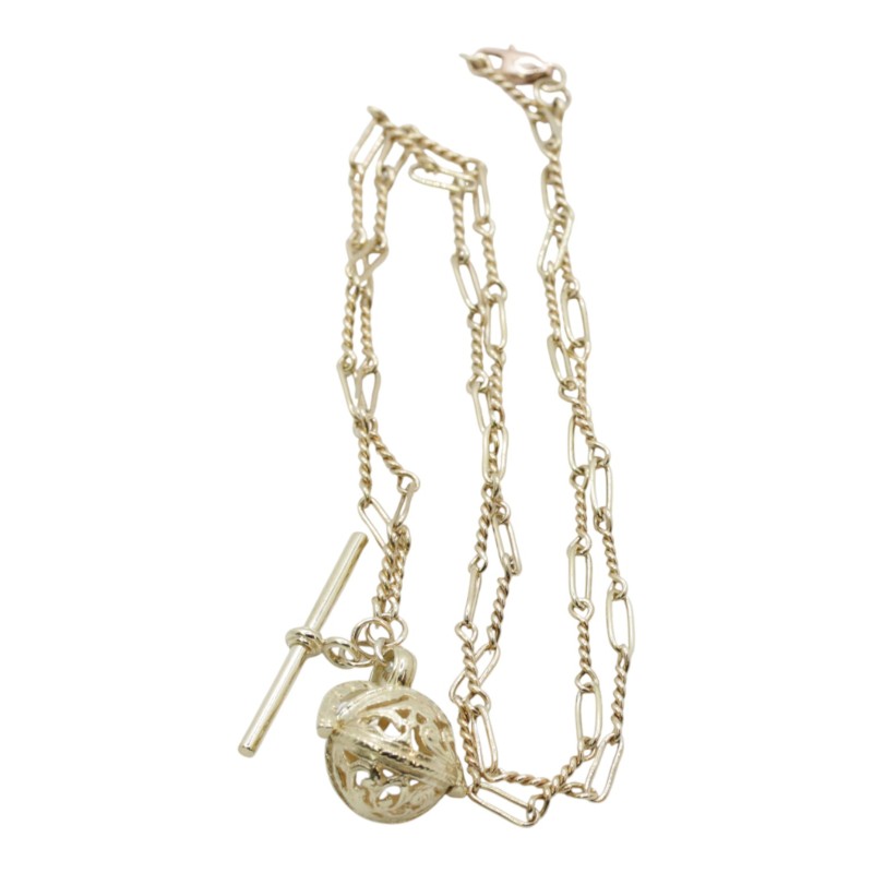 This elegant 9ct yellow gold necklace features a fancy link chain with a bar and spherical filigree pendant. The 375 hallmark indicates the high-quality 9 karat gold construction. Weighing 18.76 grams, this versatile ladies' necklace is the perfect accessory for any occasion. All sizes and measurements are approximate.