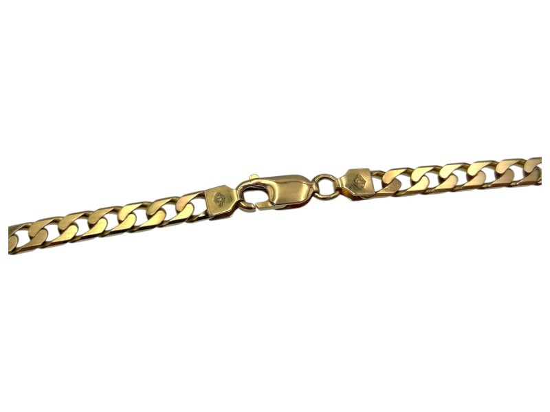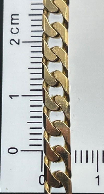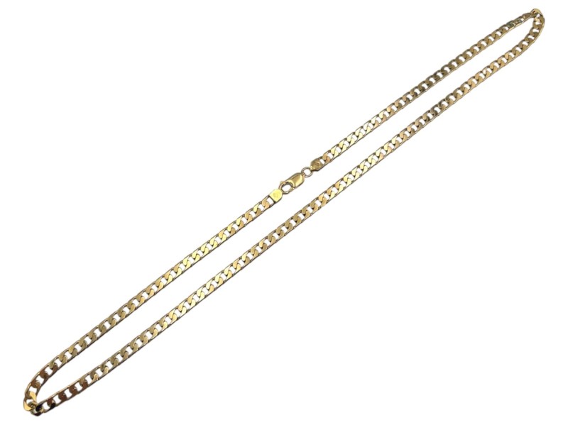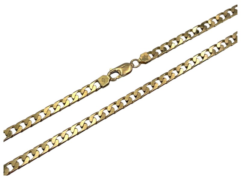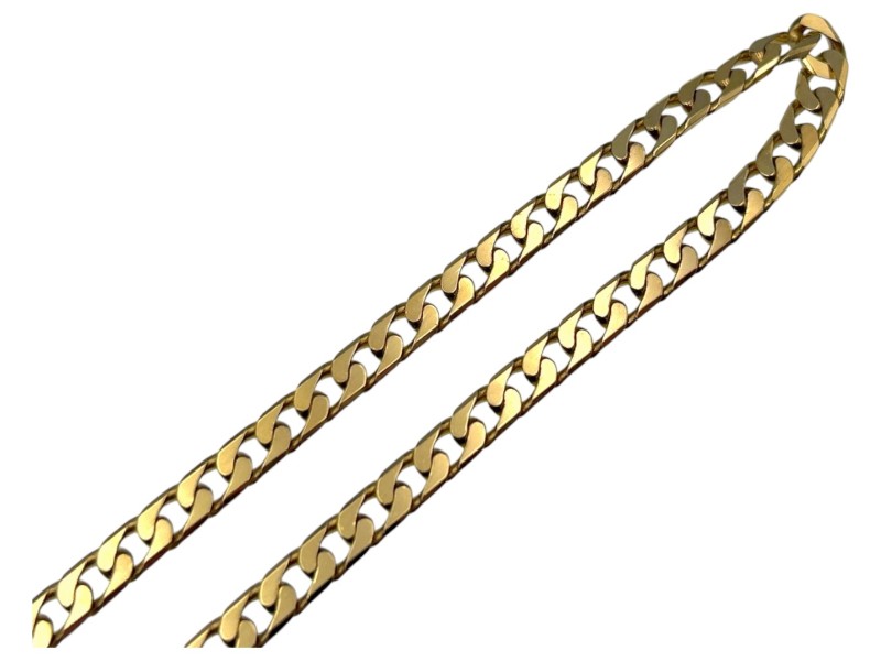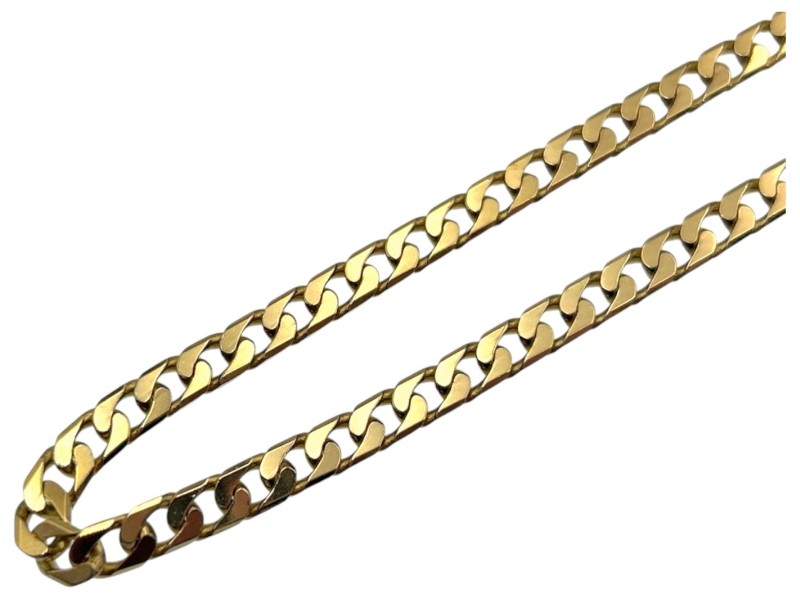 This 9 karat yellow gold necklace has a unique shape and measures 55cm in length, weighing a substantial 24.69 grams. The necklace features a hallmark of .375, indicating the purity of the precious metal. Versatile in its design, this piece can be worn by people of all genders. All sizes and measurements are approximate.