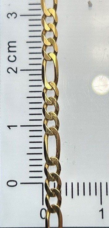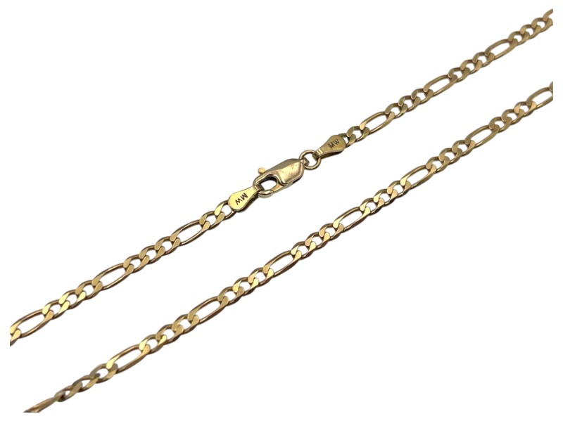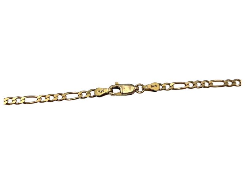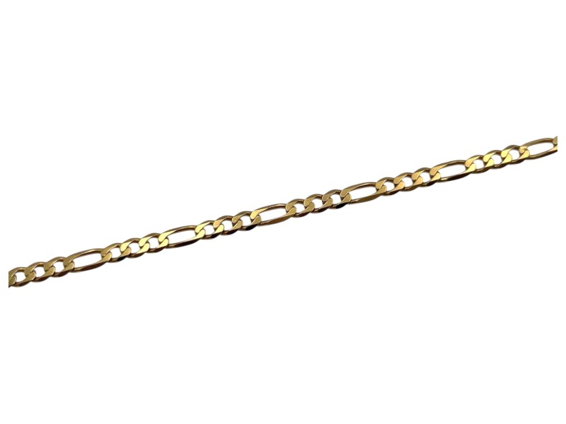 This 9 karat yellow gold Figaro necklace features a hallmark of .375. Measuring 55 cm in length and weighing 7.17 grams, this unisex chain has an engraved detail of '375'. Crafted in a classic Figaro style, this versatile necklace can be worn by anyone. All sizes and measurements are approximate.