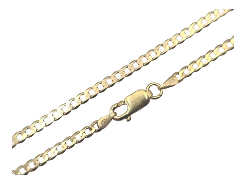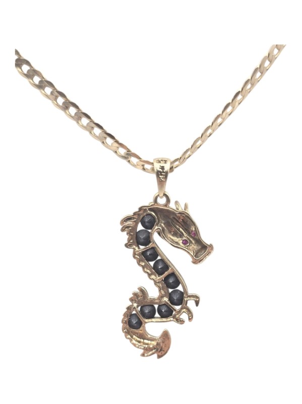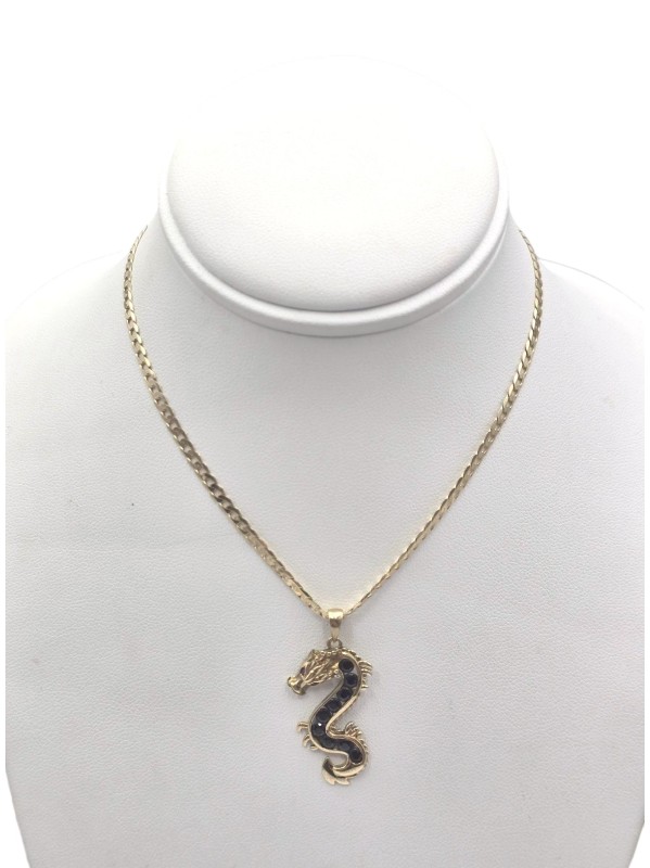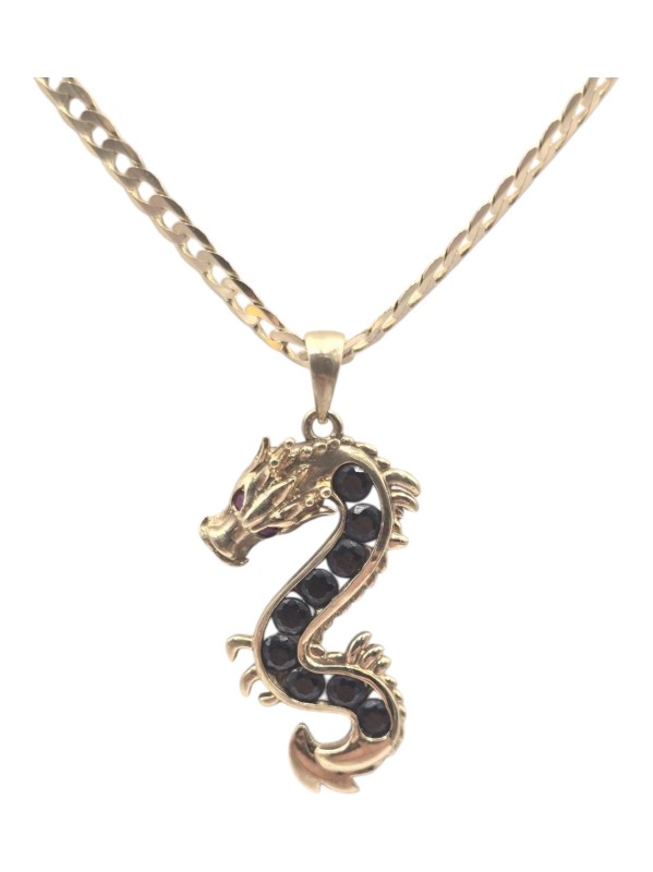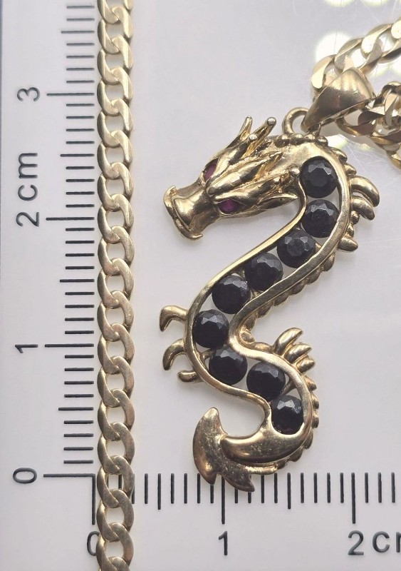 Crafted in 9 Karat yellow gold, this versatile necklace features a dragon pendant. Engraved hallmark of 375 JP. Measuring 55 cm in length and weighing 7.6 grams, this unisex necklace with a unique shape makes for a sophisticated everyday accessory. All sizes and measurements are approximate.