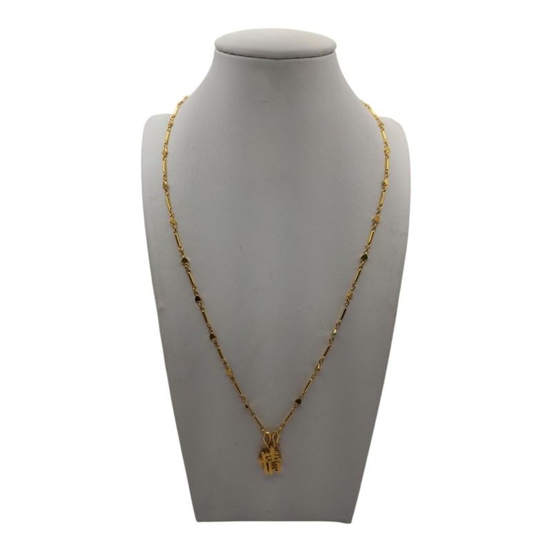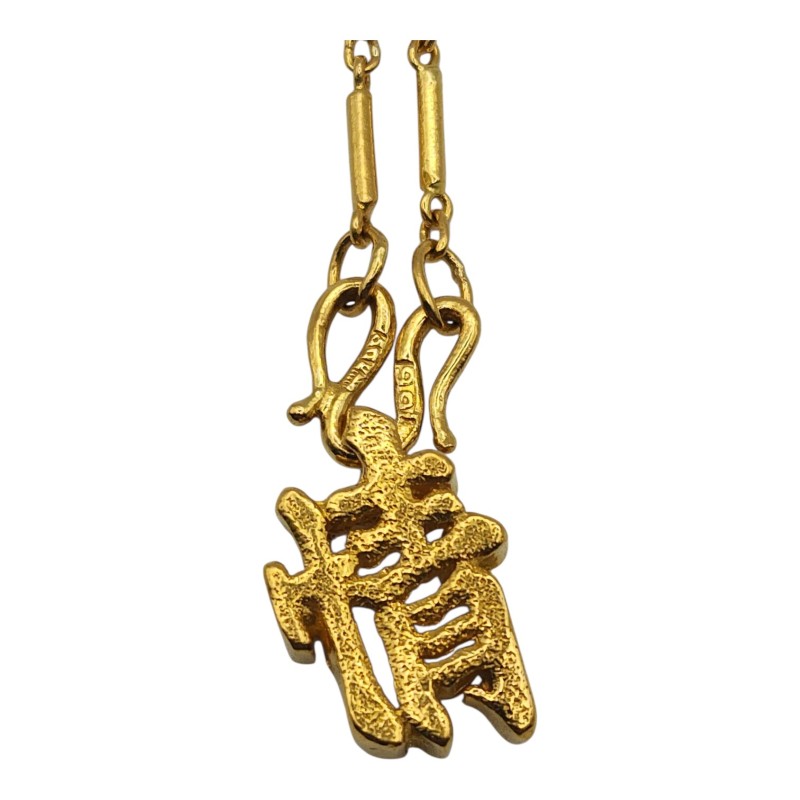 Crafted in lustrous 24 Karat yellow gold, this elegant necklace features a pendant with a Chinese character design. The bar and heart shape create a harmonious blend of geometric and organic elements. Weighing a substantial 14.75 grams, this piece is a timeless addition to any ladies' jewellery collection. The intricate engraving detail of "9999" adds a touch of personalization. All sizes and measurements are approximate.