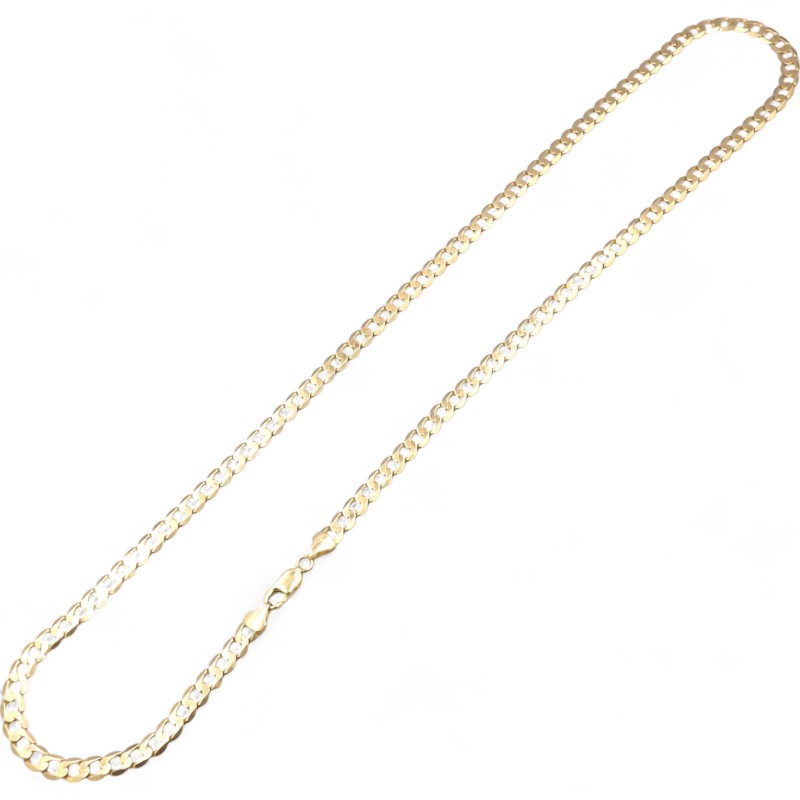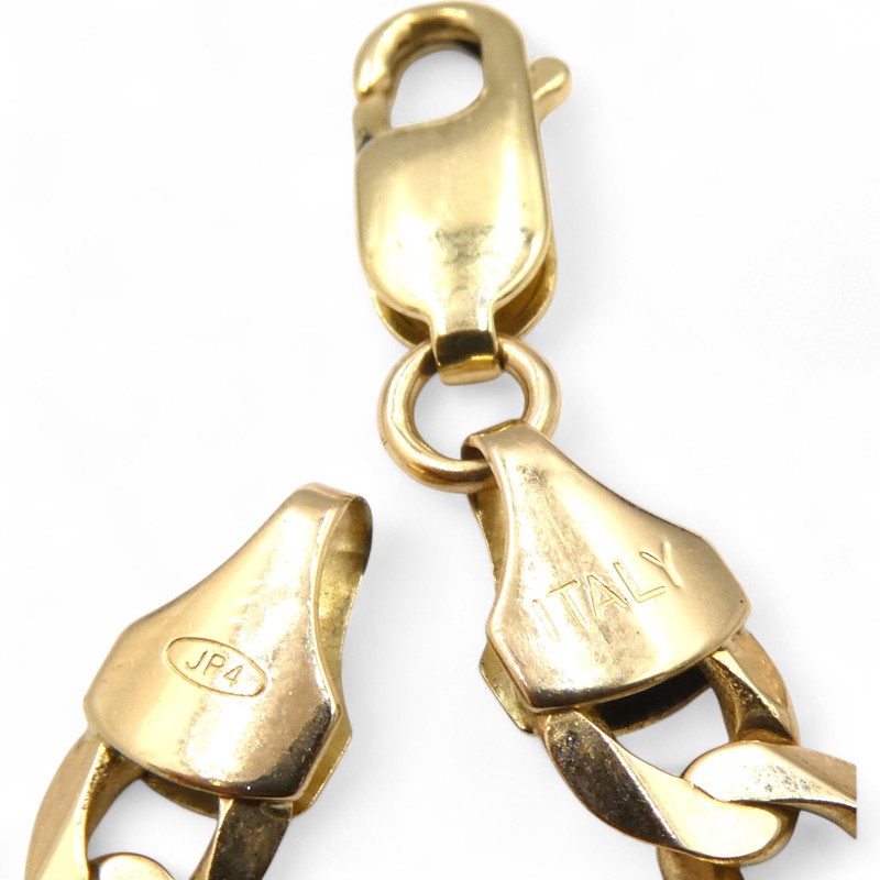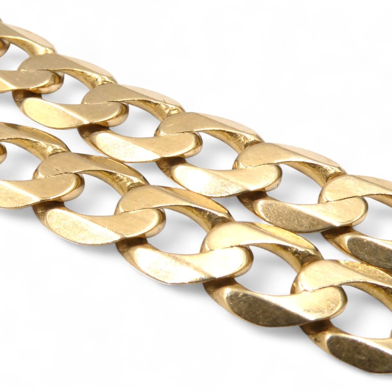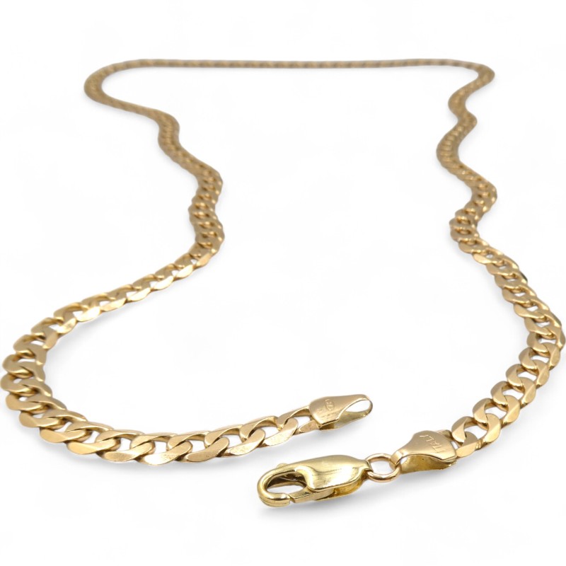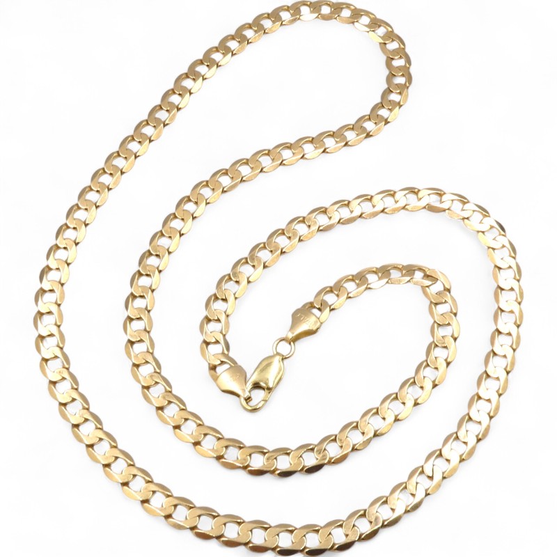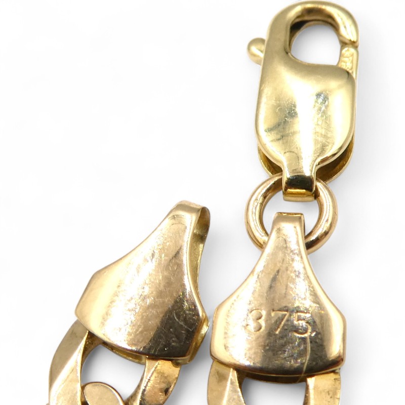 This 9K yellow gold necklace features a bevelled edge curb link design and weighs a substantial 24.5g. Hallmarked .375 and engraved 'ITALY 375', this unisex piece measures a generous 64cm in length with a 0.6cm width. Crafted in durable 9 karat yellow gold, this necklace is a classic, versatile accessory suitable for any occasion. All sizes and measurements are approximate.