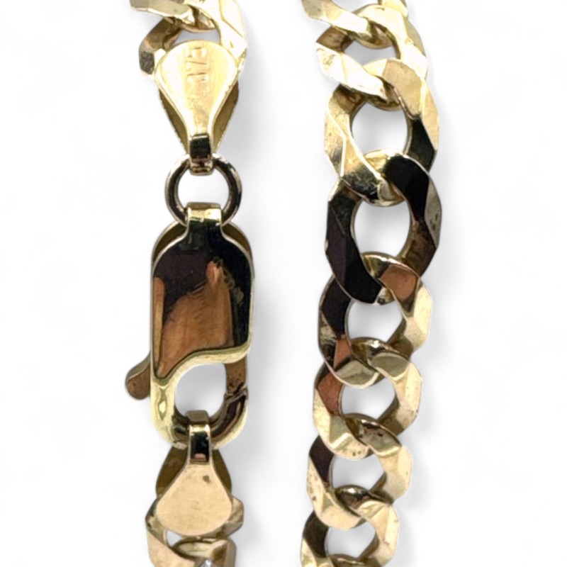 This stunning 9K yellow gold necklace features a classic link design. Crafted from 13.25g of durable 9 karat yellow gold, the necklace measures a generous 55.5cm in length and 0.5cm in width. The hallmark of .375 confirms the precious metal content. The engraved details "JP4 375 ITALY" add an elegant touch of provenance. This timeless necklace is perfect for effortless everyday wear. All sizes and measurements are approximate.