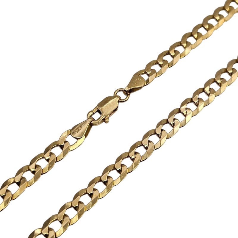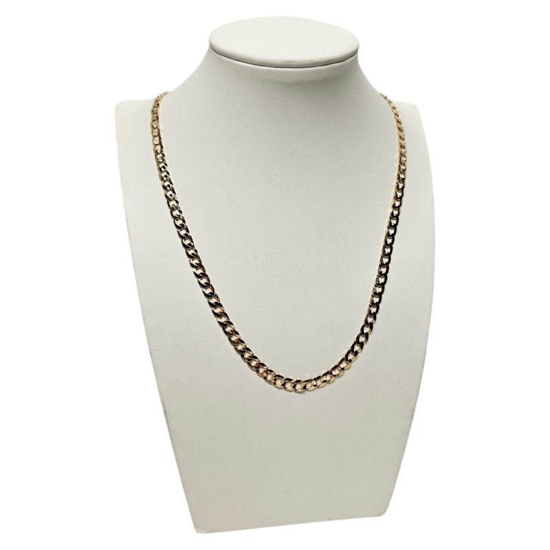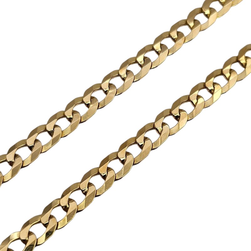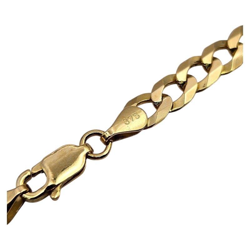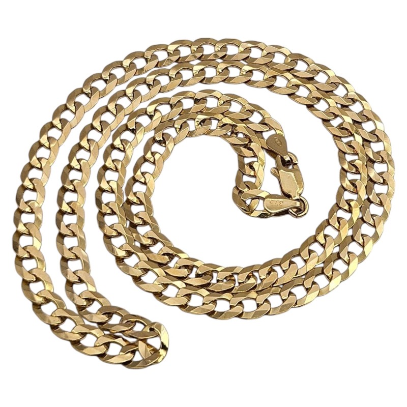 This 9 Karat yellow gold curb link necklace features a classic filed curb link design. Hallmarked .375 for quality assurance, the necklace measures 55.8 cm in length and weighs a substantial 12.25 grams. Suitable for all genders, this versatile piece is engraved with the '375 ITALY' stamp of authenticity. All sizes and measurements are approximate.