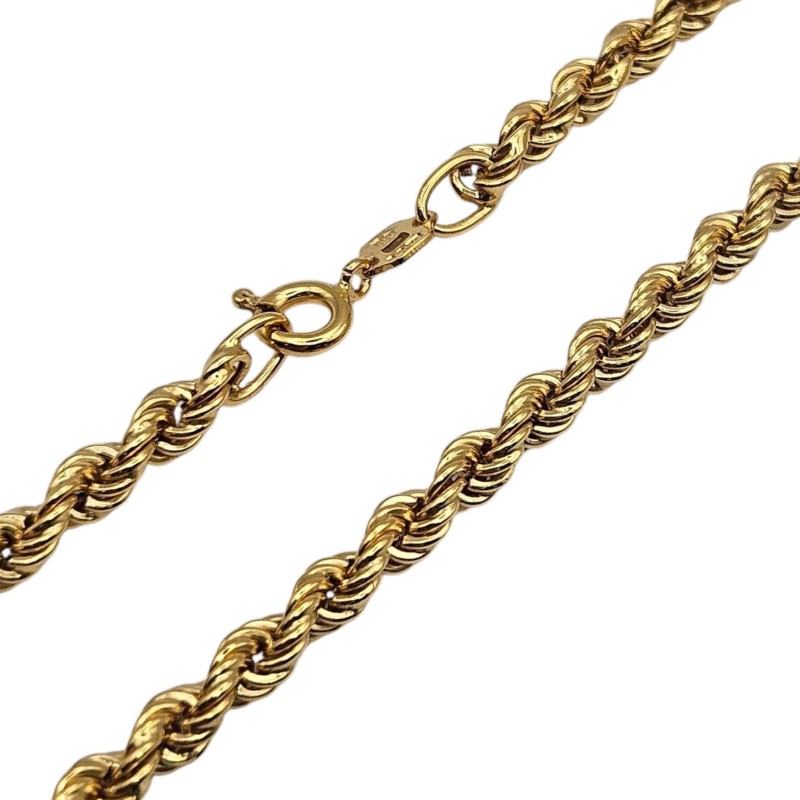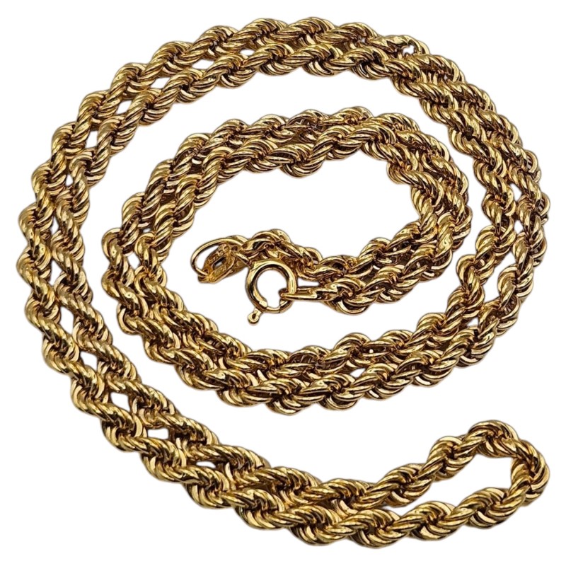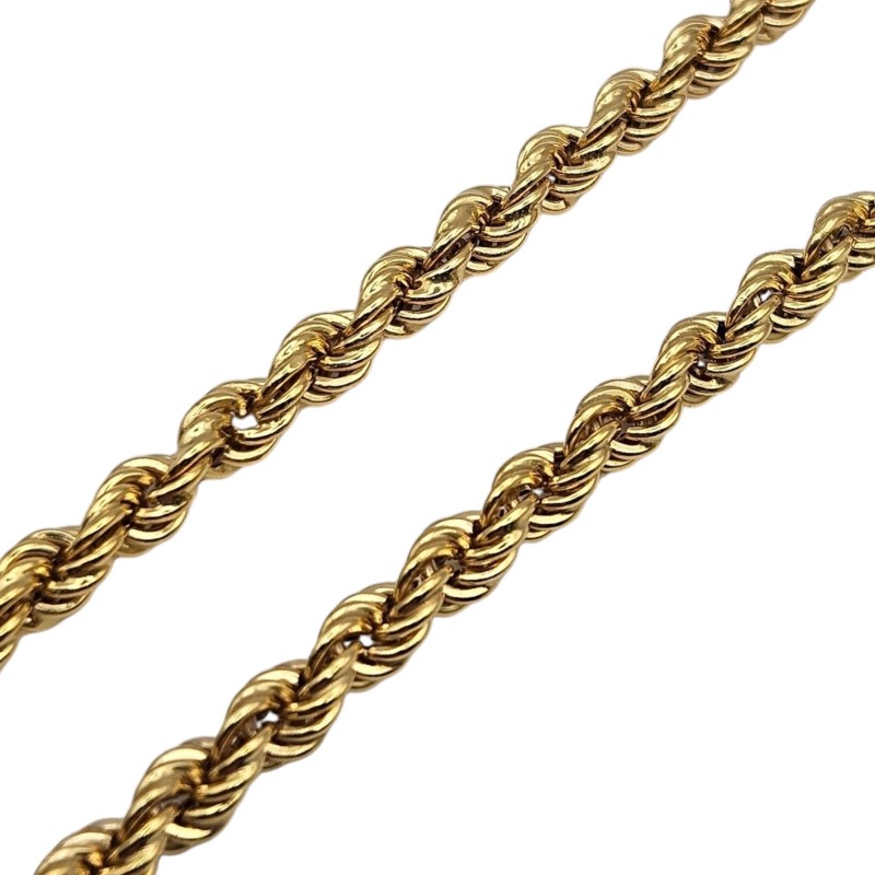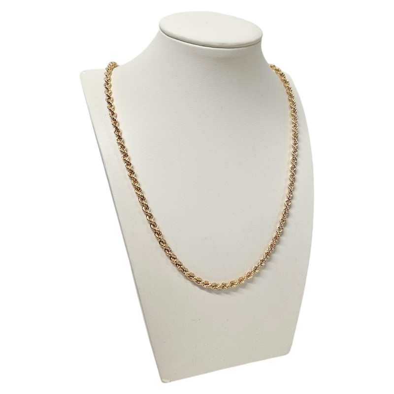 This elegant 9 karat yellow gold necklace features a classic rope chain design. Measuring 62 cm in length and weighing 16.01 grams, this necklace is a timeless accessory for the modern lady. The 9 karat yellow gold material provides a warm, radiant tone that effortlessly complements a variety of outfits. All sizes and measurements are approximate.