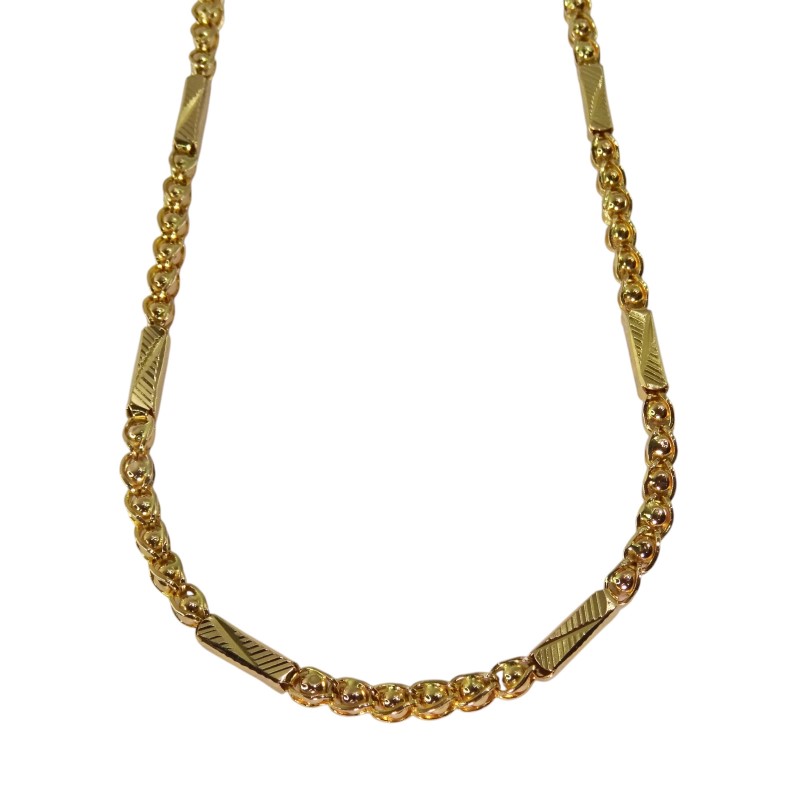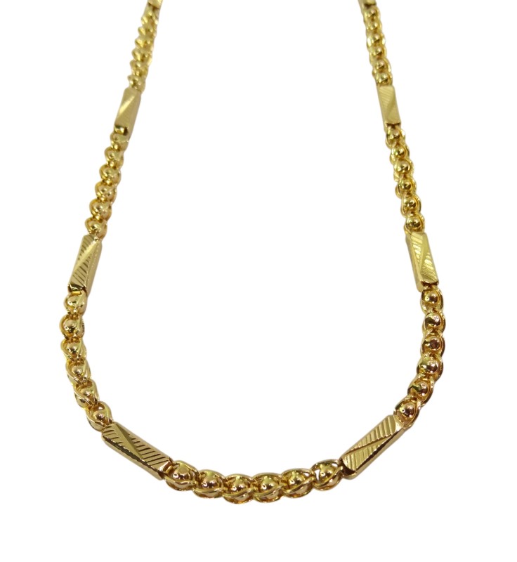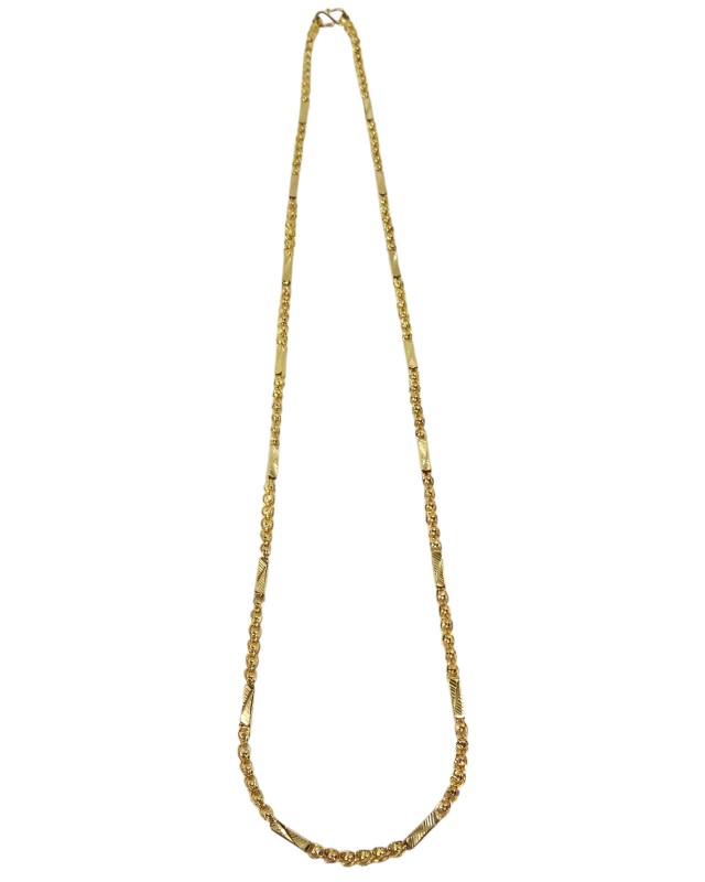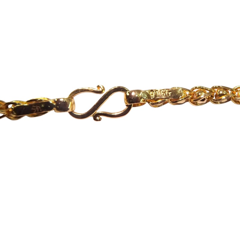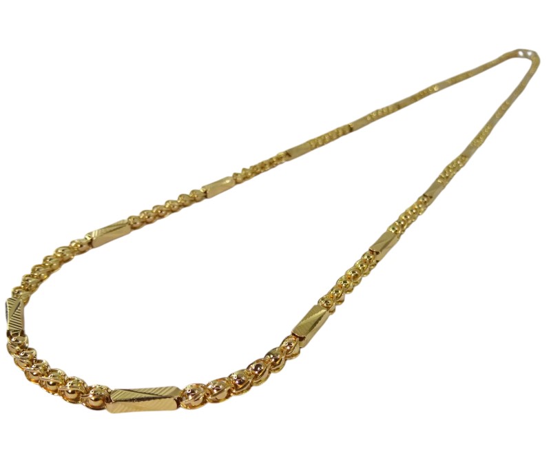 This 22ct yellow gold necklace features a fancy design and an engraving of 'CHJ 916G'. Crafted with a hallmark of .916, this unisex piece weighs 23.48 grams, making it a substantial yet wearable accessory. The warm hue and luxurious feel of yellow gold have made it a cherished material for centuries, known for its radiant glow and enduring quality.