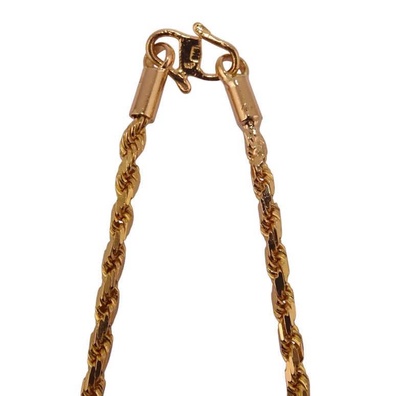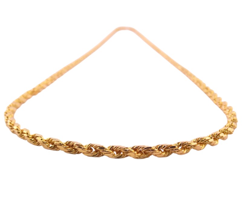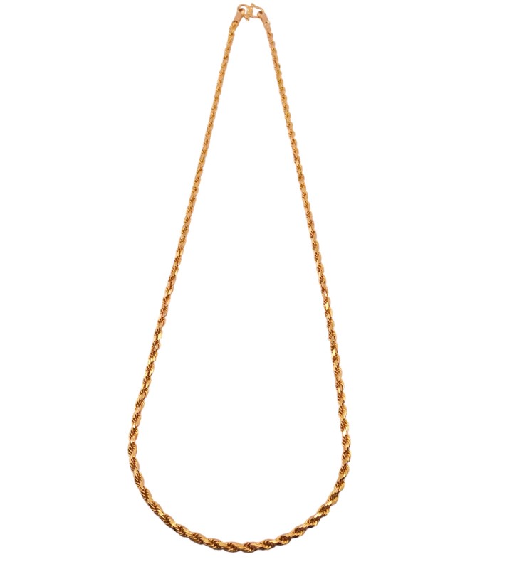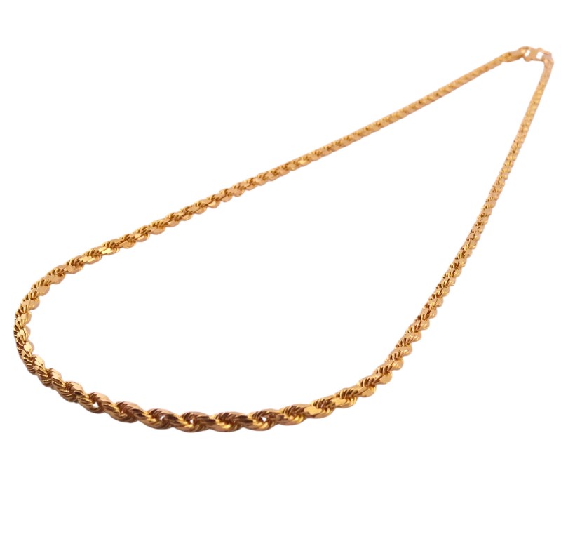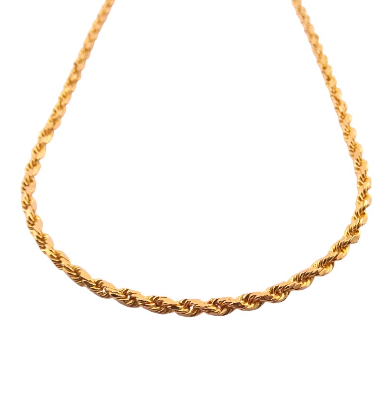 This exquisite 22K yellow gold necklace features a classic rope design. Crafted from premium 916 hallmarked yellow gold, this ladies necklace measures 53.5cm in length and weighs a substantial 25.51 grams. The delicate 0.2cm width adds a refined elegance. Engraved with the 22K 916 mark, this necklace is a timeless accessory that will complement any outfit.