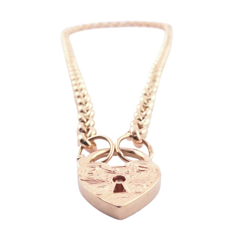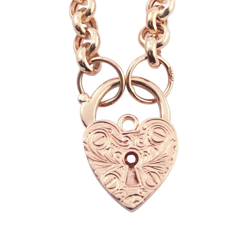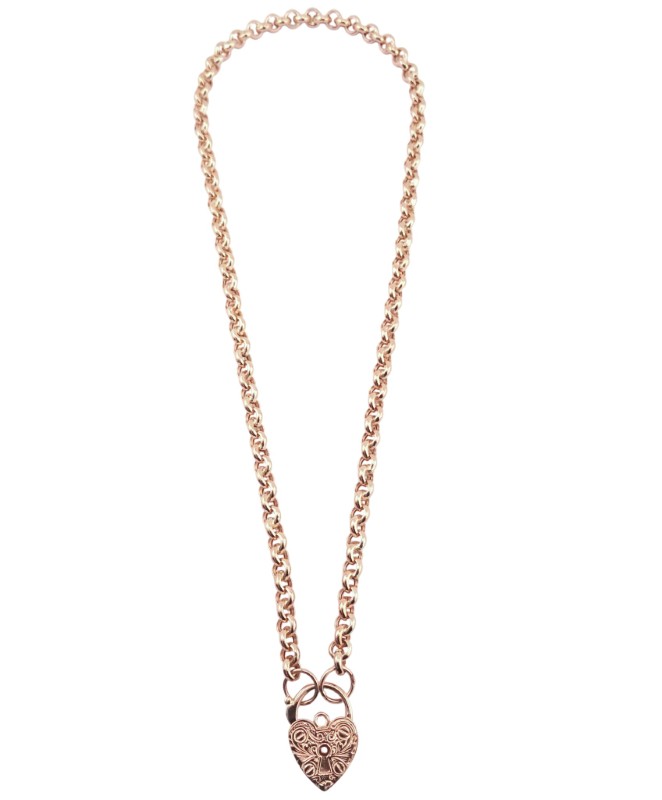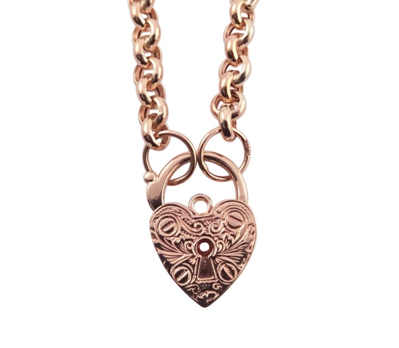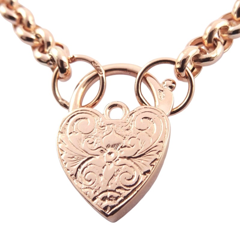 This stunning 375 rose gold heart-shaped pendant necklace features delicate engraved details on the padlock charm and a belcher-link chain. Measuring 45.5cm in length and weighing a substantial 17.36g, this timeless piece is the perfect addition to any jewellery collection. Elegant and understated, the simple heart shape and rose gold hue make this necklace a versatile everyday accessory.