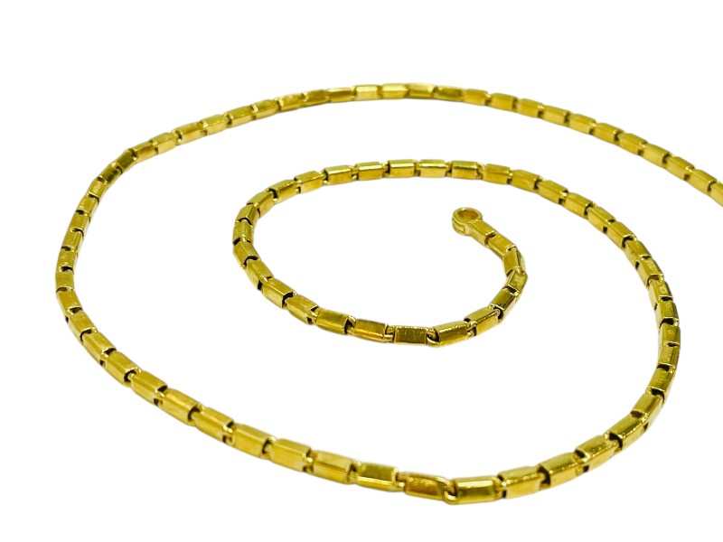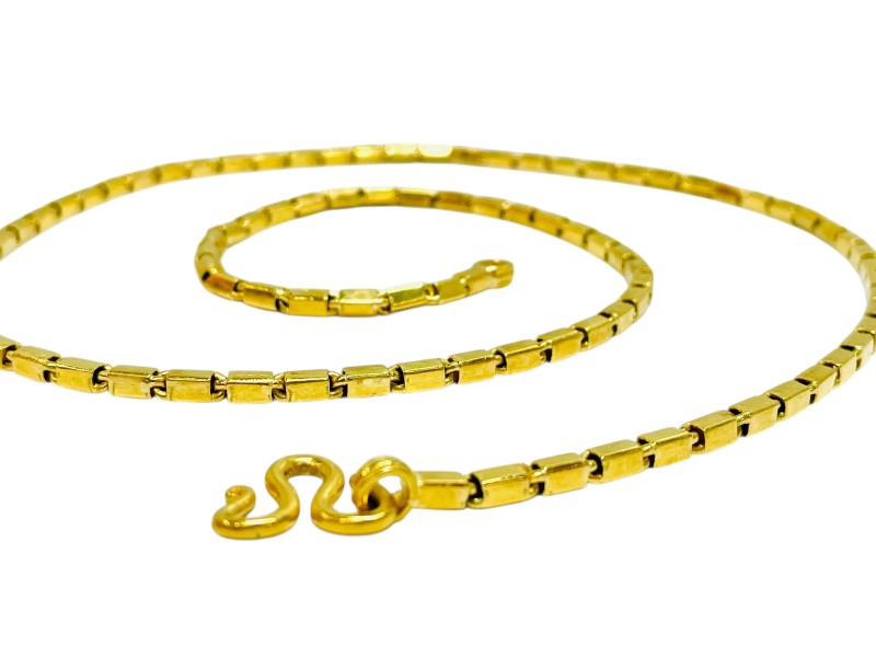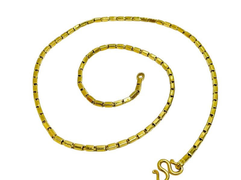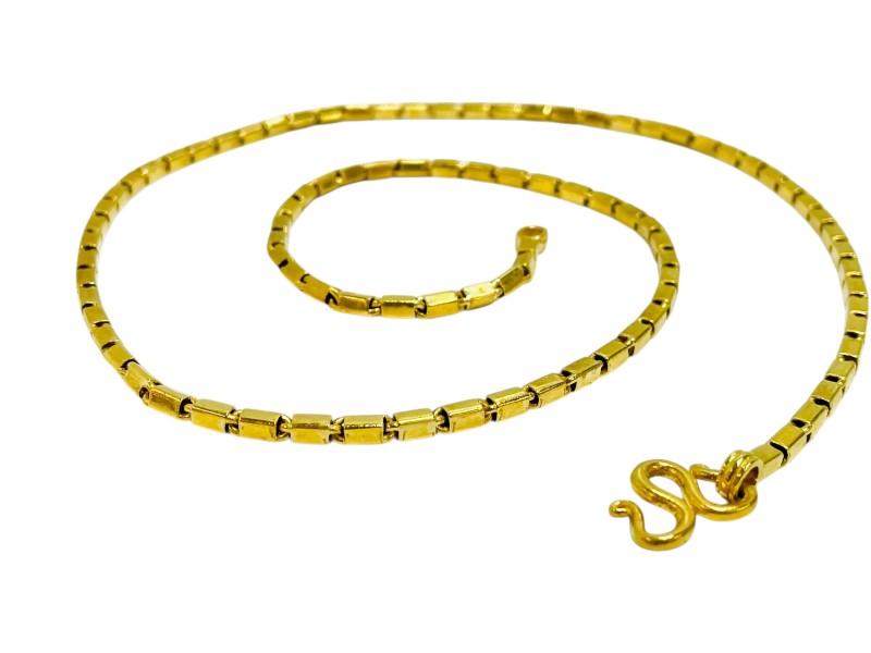This striking 22k yellow gold box link necklace is a timeless accessory. Crafted from 22 karat gold, this necklace measures a substantial 67 cm in length and weighs an impressive 60.95 grams. The classic box link design creates a sleek and sophisticated look that will complement any outfit. Whether dressed up or down, this necklace is a versatile piece that will elevate your style. All sizes and measurements are approximate.