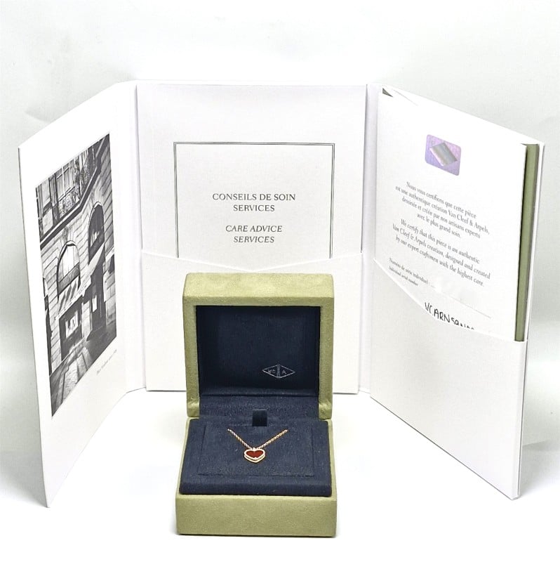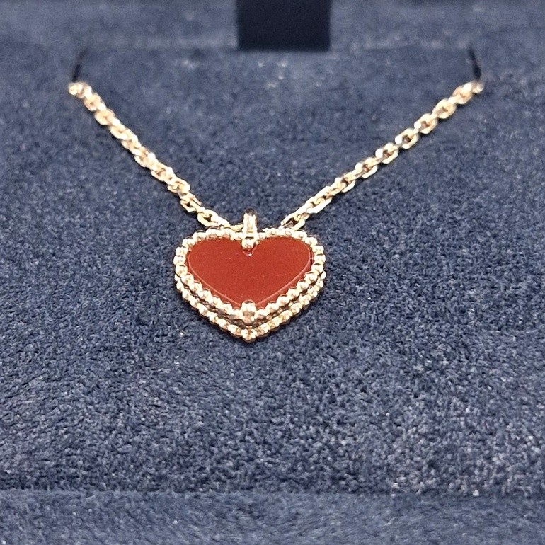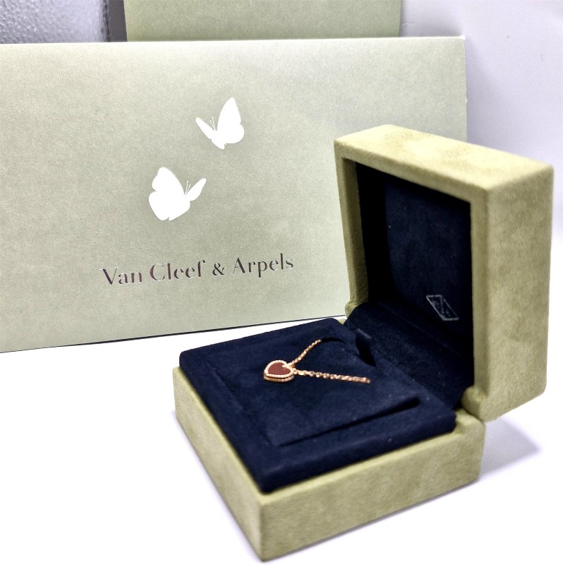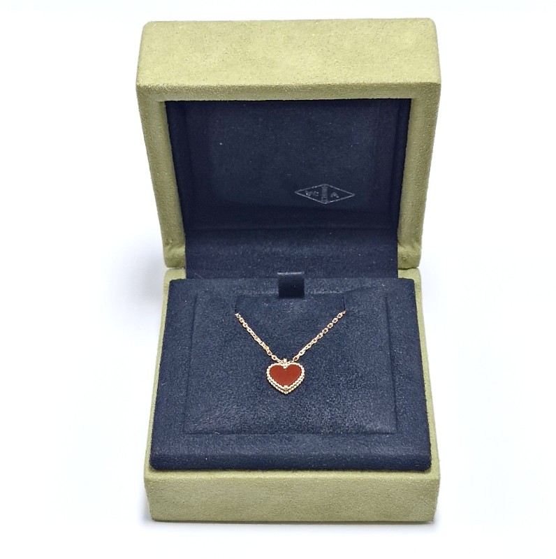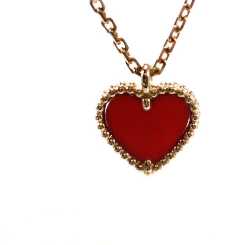 This exquisite 18k rose gold necklace from Van Cleef & Arples features a striking heart-shaped carnelian pendant. Crafted with a hallmark of .750, this piece weighs a delicate 2.78 grams, creating a refined and elegant look. The natural beauty of the carnelian stone takes centre stage, complemented by the warm tones of the rose gold setting. This versatile necklace can be worn for any occasion, adding a touch of timeless charm to your ensemble. All sizes and measurements are approximate.