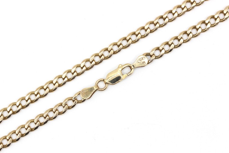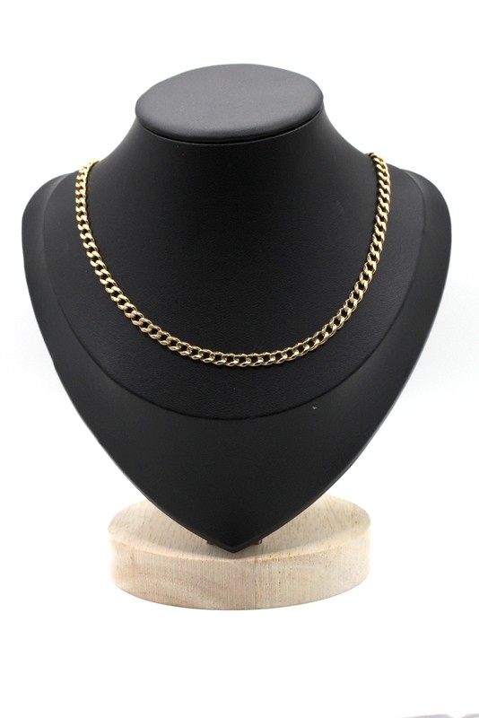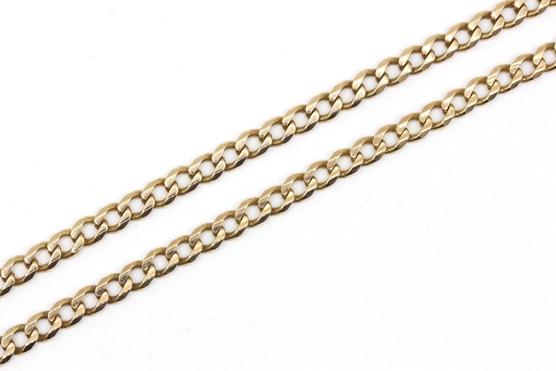 This 9 karat yellow gold link necklace features a hallmark of .375, indicating the quality of the precious metal. Weighing a substantial 19.29 grams, this necklace is a classic piece that can be worn for any occasion. The sleek, minimalist design makes it a versatile accessory to complement a variety of outfits. With its simple yet refined aesthetic, this necklace is a timeless addition to any jewellery collection.