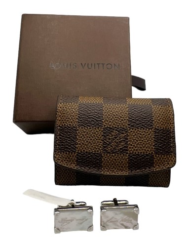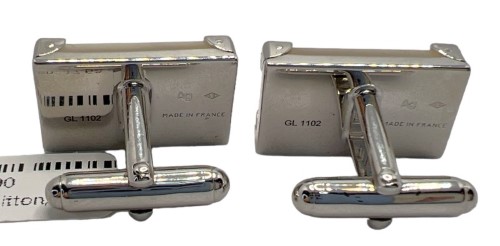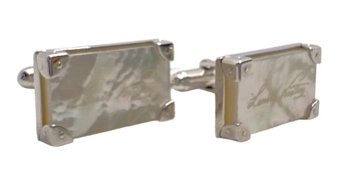 These sophisticated Louis Vuitton cufflinks showcase a striking rectangular design in gleaming silver-toned metal. The cufflinks feature a unique mother-of-pearl accent, adding a subtle yet distinctive touch. Engraved with the style code 'GL1102 AG' and the 'MADE IN FRANCE' stamp, these accessories are finished with an elegant aesthetic. Weighing approximately 17.68 grams, this pair of mens cufflinks provides the perfect refined accent to any formal ensemble. All sizes and measurements are approximate.