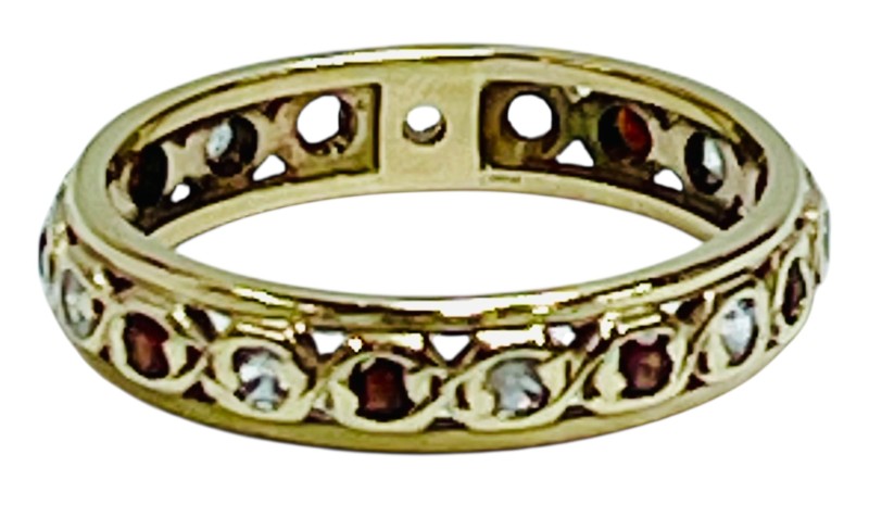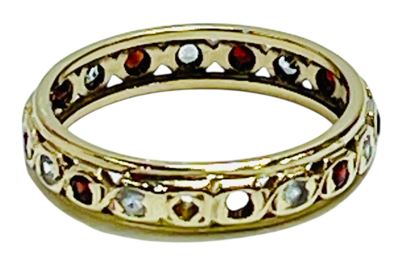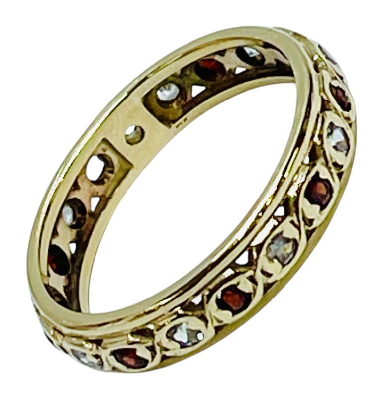 This 9ct yellow gold ring features a classic plain design with two contrasting stones. The combination of a vibrant red stone and a clear stone creates an eye-catching look. Weighing 2.33g, this ring has a size M band that will comfortably fit most wearers.