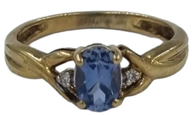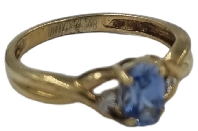 This 9 karat yellow gold ring features a unique design with a blue centre stone accented by two clear stones. Weighing a lightweight 1.23 grams, this ring has a hallmark of .375 and a size H fitting.