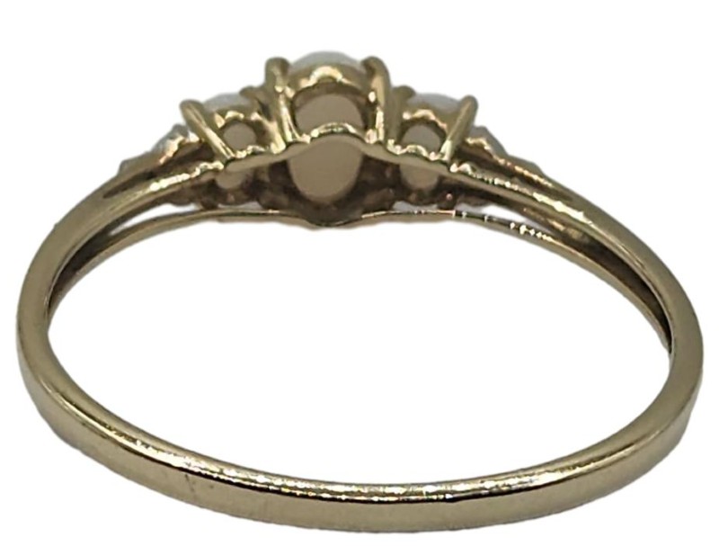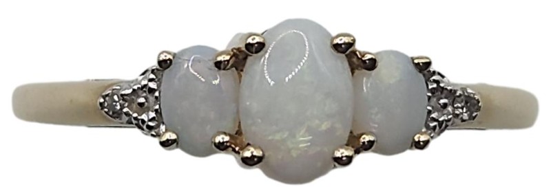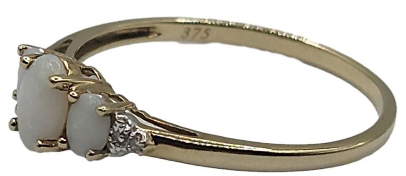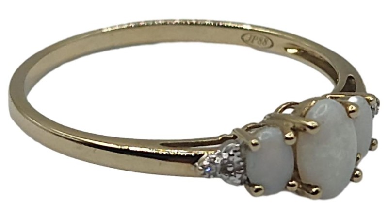 This elegant 9ct yellow gold ring features a captivating cluster of three oval-cut opals. Weighing 1.34g with a size T band, this timeless piece is engraved with the hallmarks '375 JP88', indicating its 9ct gold composition. The smooth ring band complements the cluster setting, creating a sophisticated and modern design suitable for everyday wear.