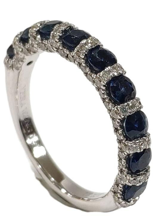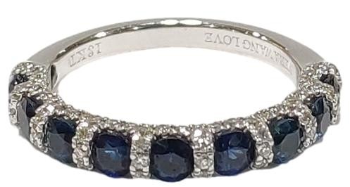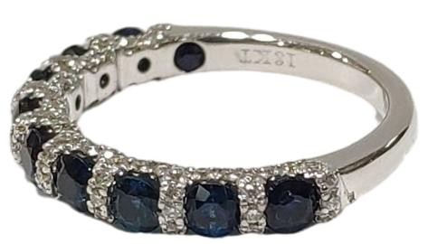 This glistening White Gold Ring Features Nine Round Faceted Sapphires TDW 1.08cts (Colour: Med Bright Blue- Clarity: Type II) & One Sapphire TDW 0.03cts (Colour: Med Blue- Clarity: Type II) & Eighty Five Round Brilliant Cut Diamond TDW 0.425cts (Colour: G-I- Clarity: SI-P1) & One Single Cut Diamond TDW 0.003cts (Colour: G-I- Clarity: VS)
