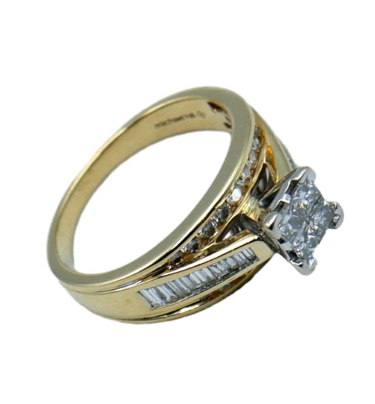 This 14ct yellow gold princess-cut diamond ring features a 0.09ct G-colour diamond centre stone, surrounded by 32 clear diamonds totalling 1.07ct. The smooth band is engraved with the "14k michael hill" marking. Weighing 5.72g, this elegant ring has a size P fit.