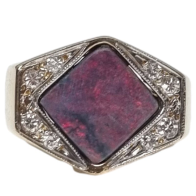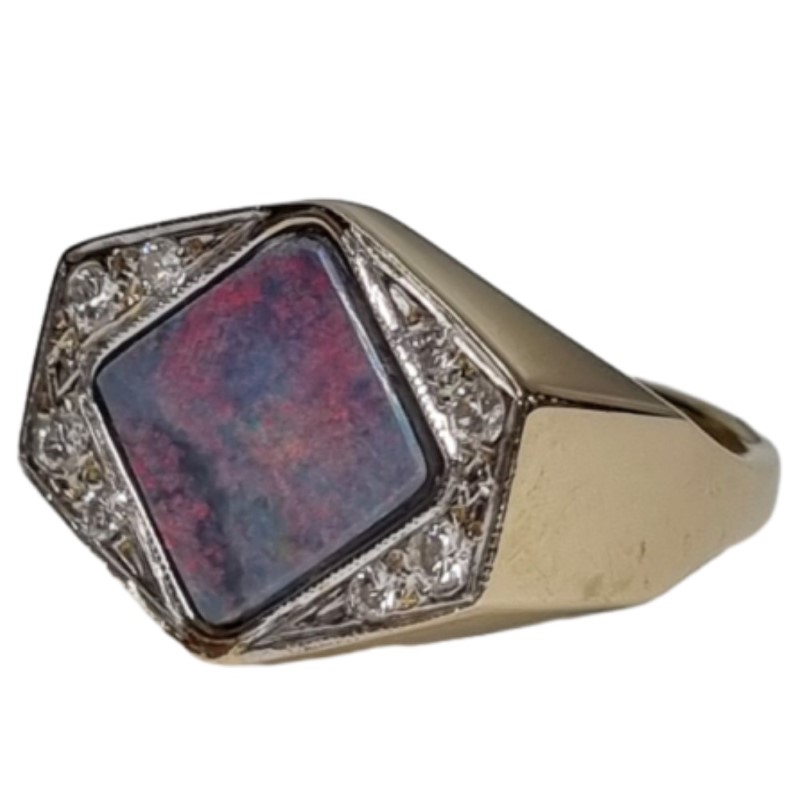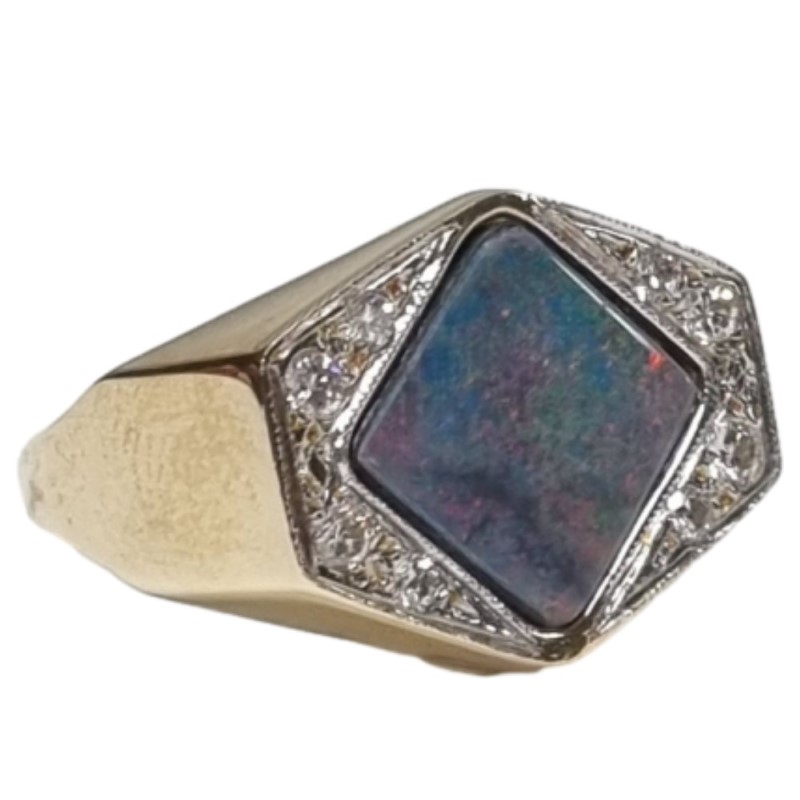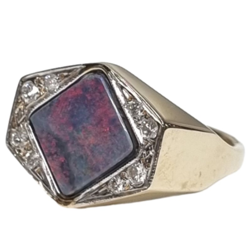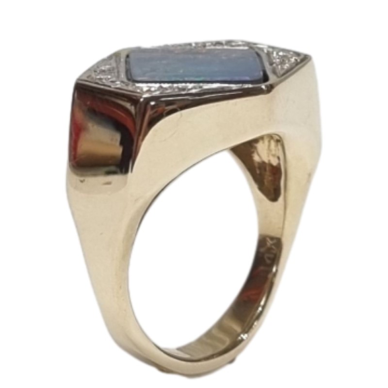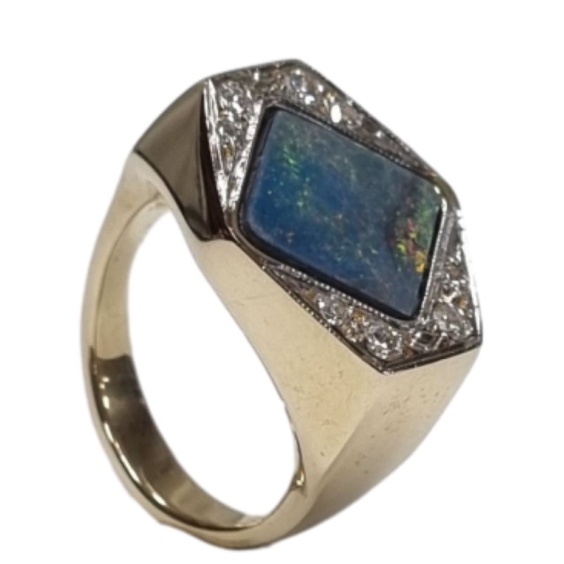 This glistening Yellow Gold Ring Features Eight Round Brilliant Cut Diamonds TDW 0.26cts (Colour: H-I - Clarity: VS-P1) & One Opal (Type One)