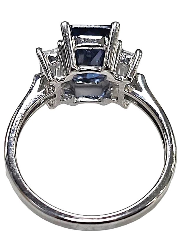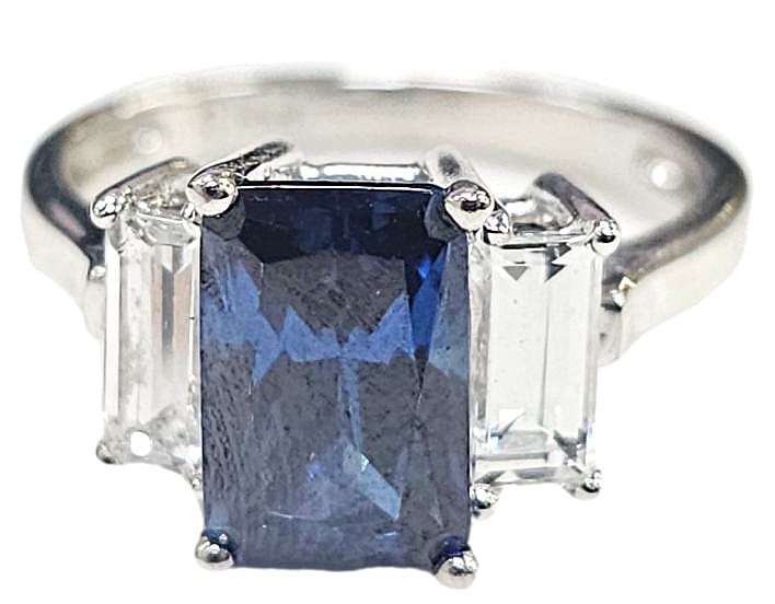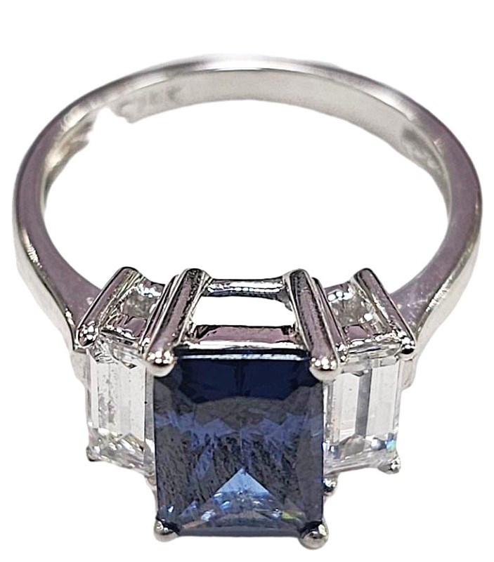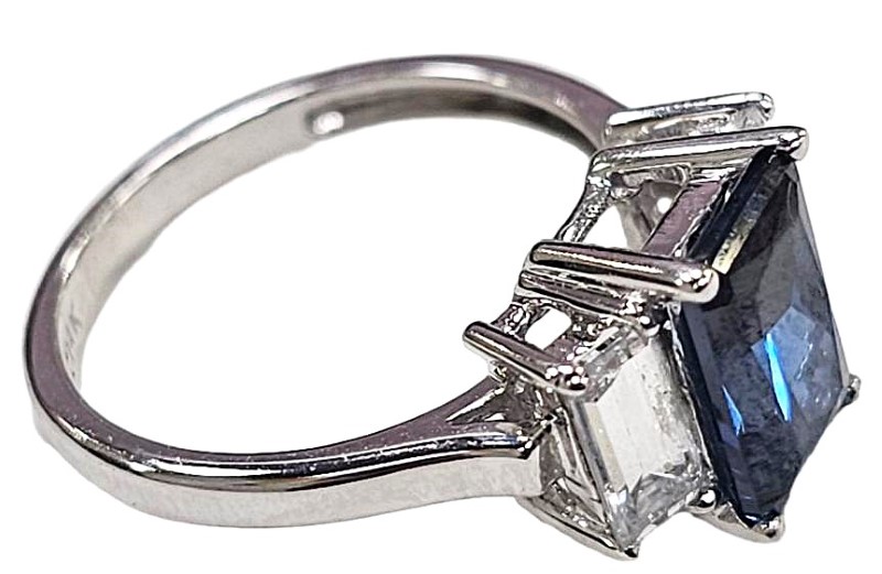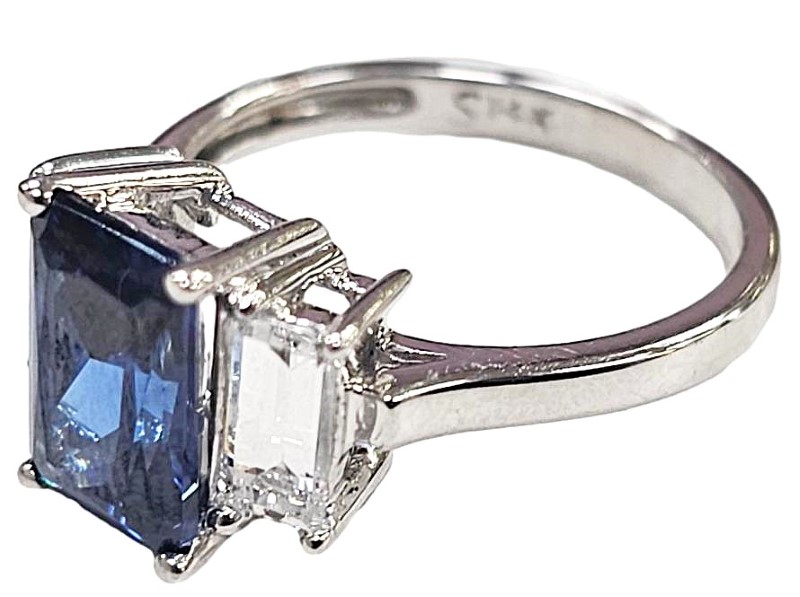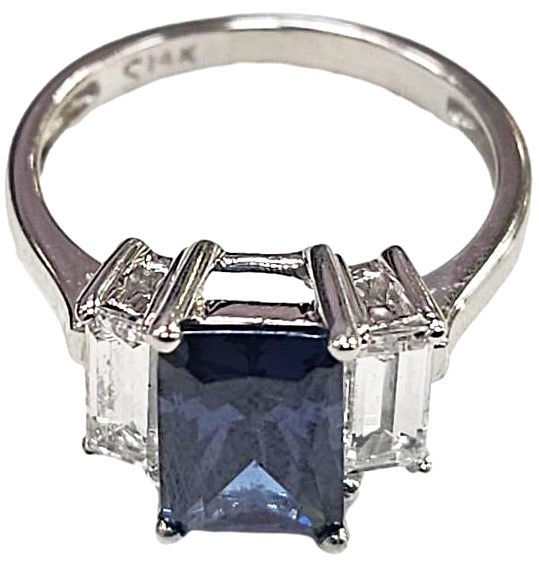This elegant 14ct white gold ring features a cluster design with two clear stones and one blue stone. The stones are set in a claw setting, creating a timeless and sophisticated look. The smooth ring band complements the cluster design, resulting in a classic and versatile piece. Weighing 3.36g, this ring has a size of J½. All sizes and measurements are approximate.