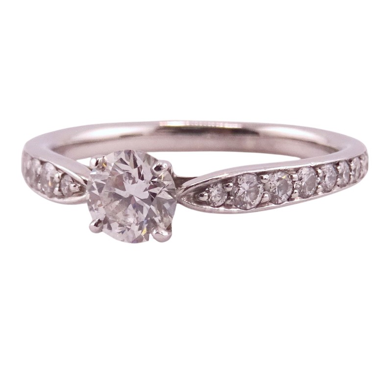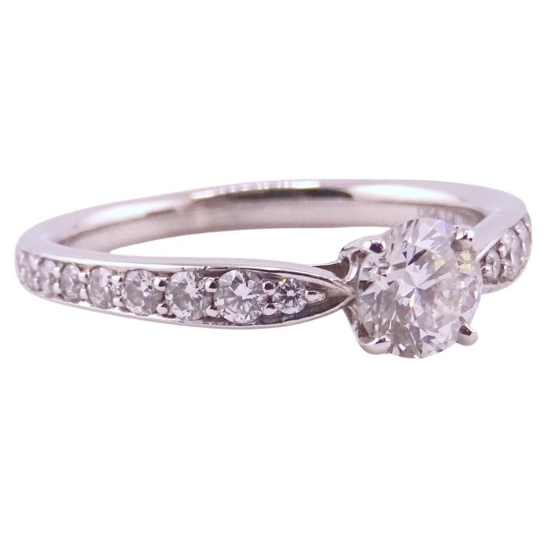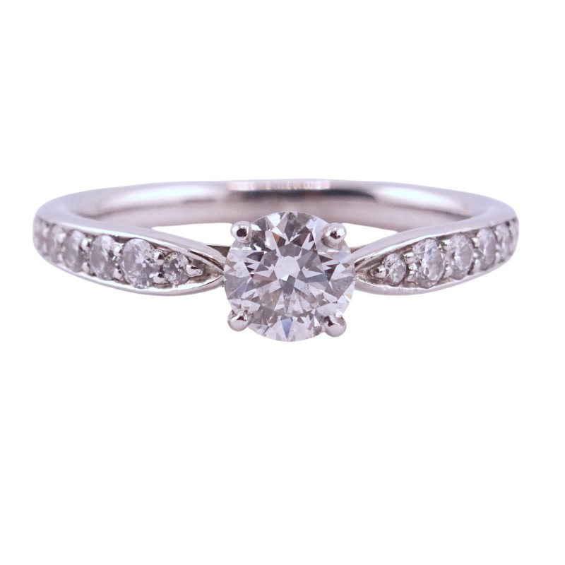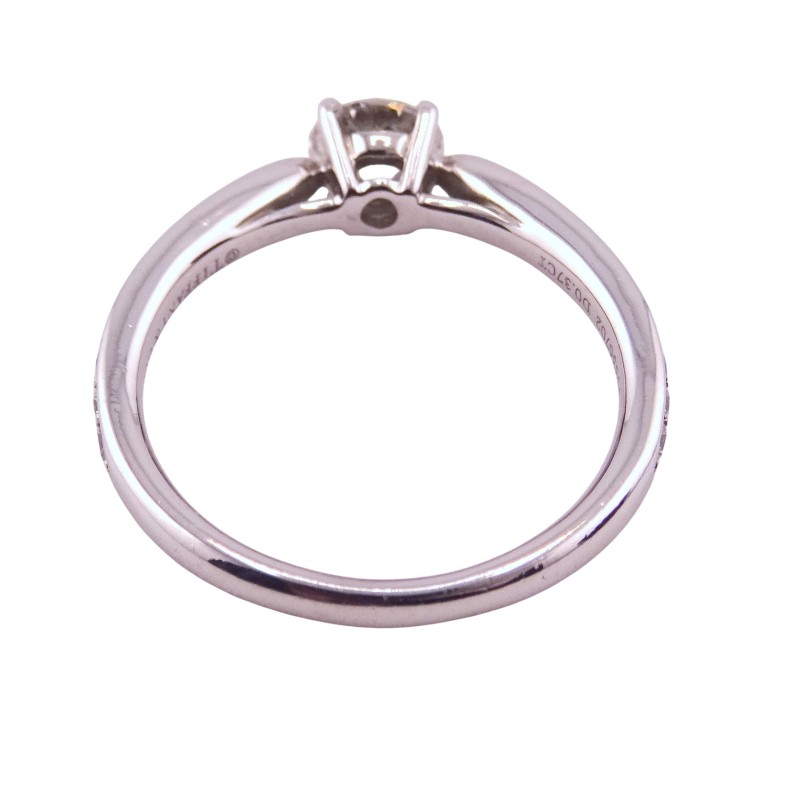 This exquisite Tiffany & Co ring showcases a stunning array of straight-set diamonds totalling 0.75 carats. Crafted from luxurious platinum, the smooth band features the prestigious PT750 engraving, denoting its exceptional 18 karat purity. Elegant and timeless, this diamond ring embodies the renowned Tiffany & Co design aesthetic. With a weight of 2.7 grams and a size H, this piece will make a sophisticated addition to any jewellery collection. All sizes and measurements are approximate.