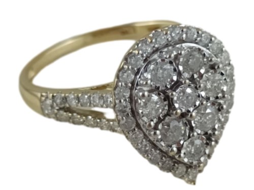 This is a gorgeous 9 karat yellow gold diamond cluster ring. It has a TDW of 1.0ct and is size P. It comes with a valuation certificate.