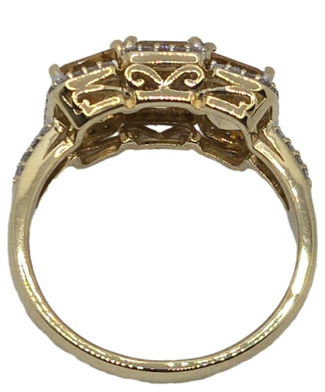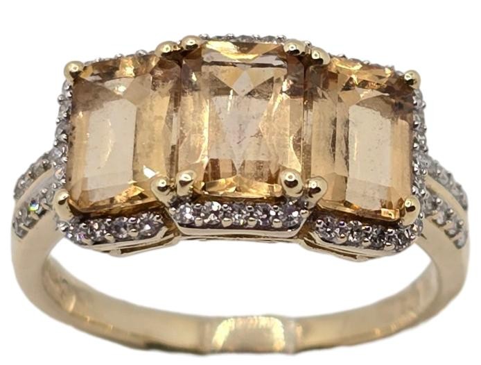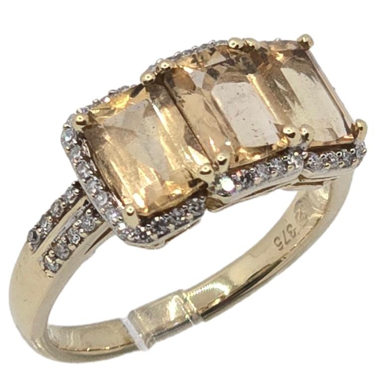This charming 9 Karat yellow gold ring features three yellow stones set in a classic ring with stone design. The ring has an approximate weight of 3.44 grams and a size O fit. The engraving details on the ring are 375. All sizes and measurements are approximate.