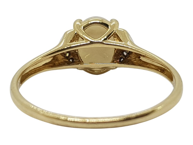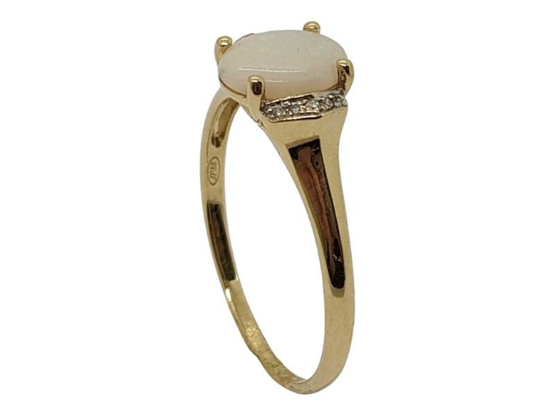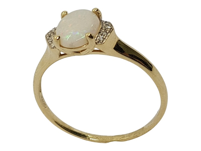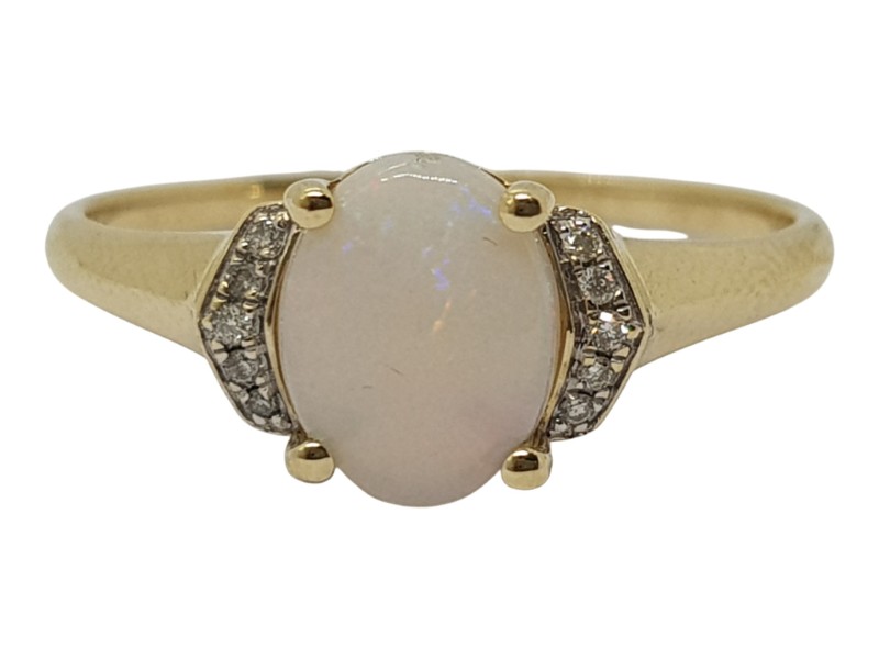 This 9 karat yellow gold ring features a vibrant opal centre stone with a total diamond weight of 0.06 carats. The smooth band and claw setting provide a classic, timeless look suitable for any wearer.
