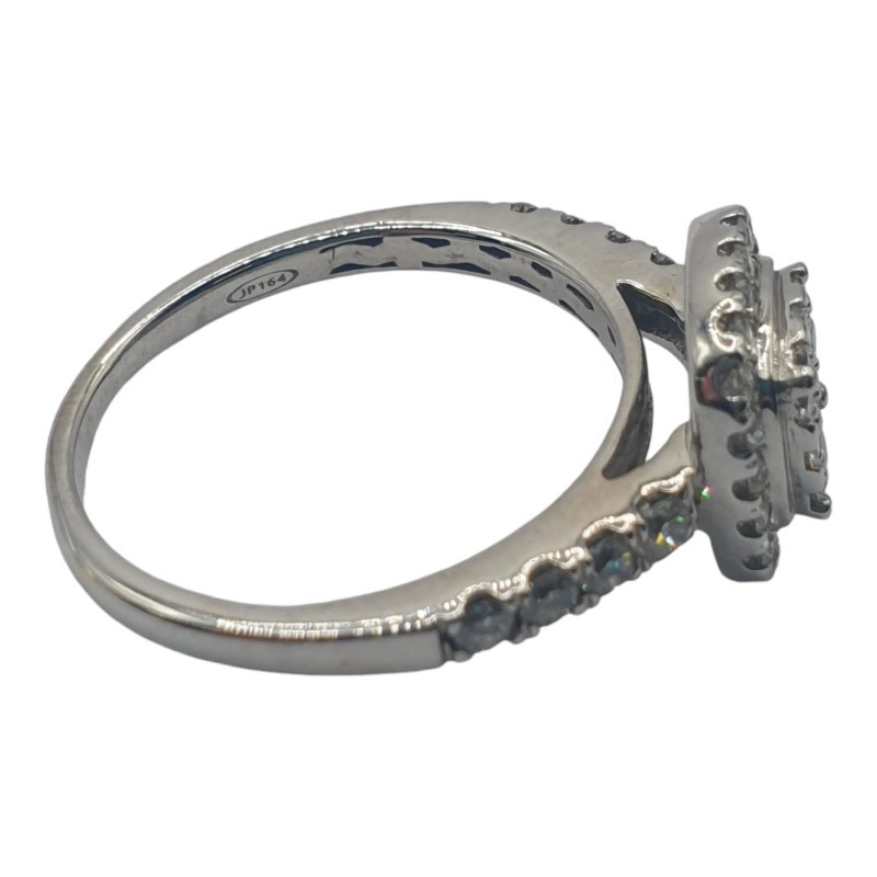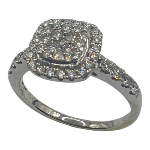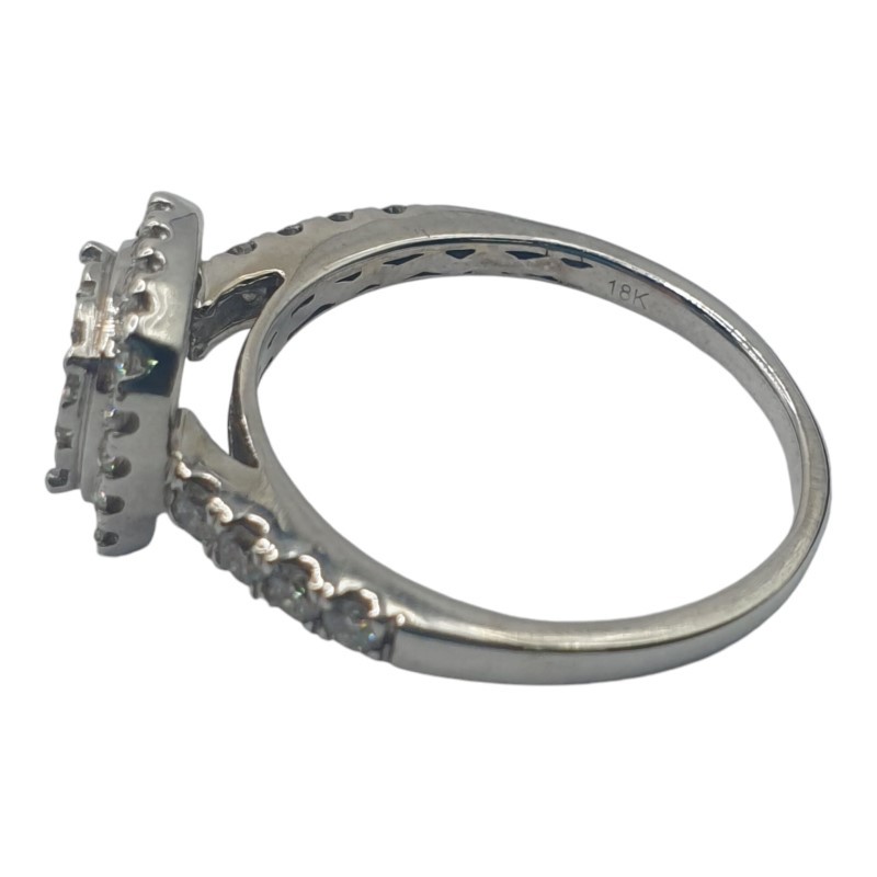 This stunning 18K white gold ring features a cluster of diamonds totaling 0.8 carats. Crafted with a classic design, this ladies' diamond ring showcases the brilliant sparkle of the stones in a timeless setting. The ring has a weight of 3.61 grams and a size O. All sizes and measurements are approximate.