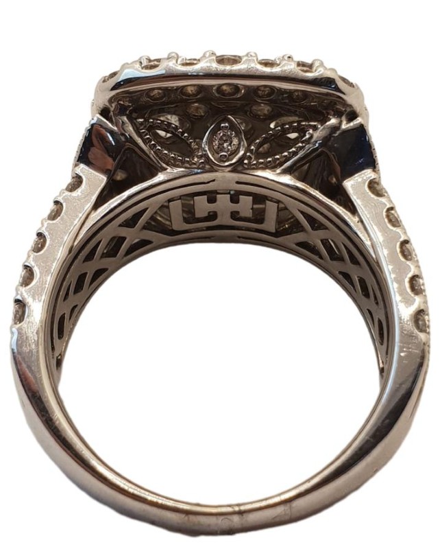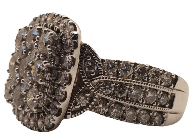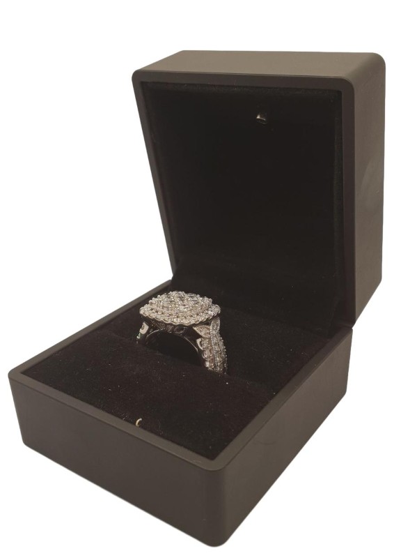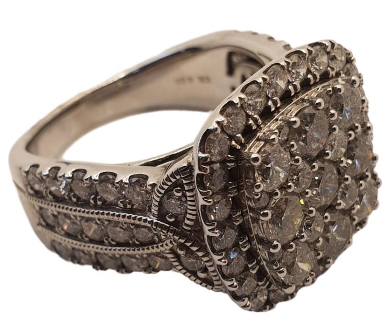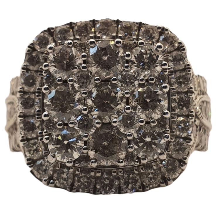 This 10K white gold cluster ring from Michael Hill features a striking 4.00 carat G-color, round brilliant-cut diamond as the hero stone. The ring is accented with 9 diamonds totaling 1.8 carats and 27 diamonds totaling 2.2 carats, all securely set in a claw setting. The smooth band has a ring size of R.