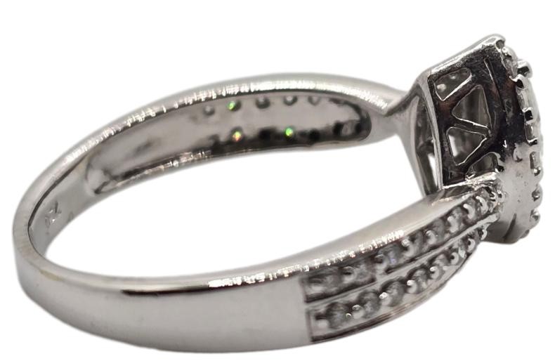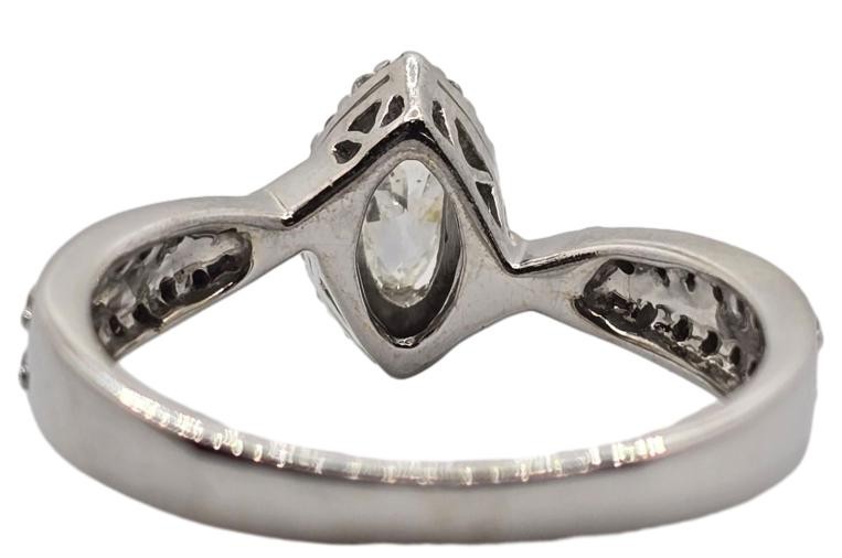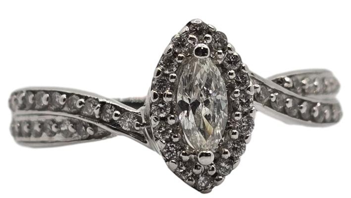 Crafted in elegant 18k white gold, this stunning ring showcases a magnificent 0.2ct marquise-cut diamond as the hero stone. Complemented by 50 additional diamonds totalling 0.45ct, the ring features a patterned band that beautifully accentuates the central gem. An exquisite choice for the modern lady, this diamond ring is set with claw prongs for a secure and sophisticated finish.