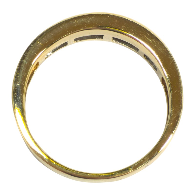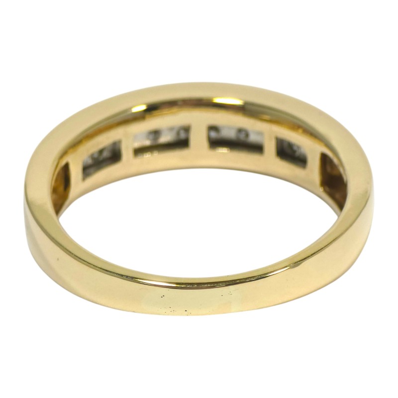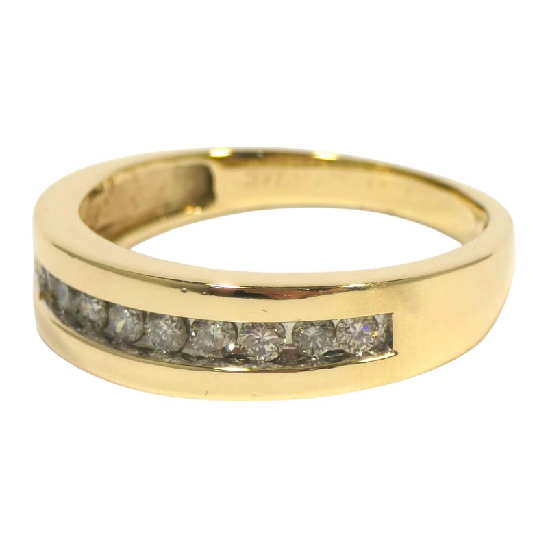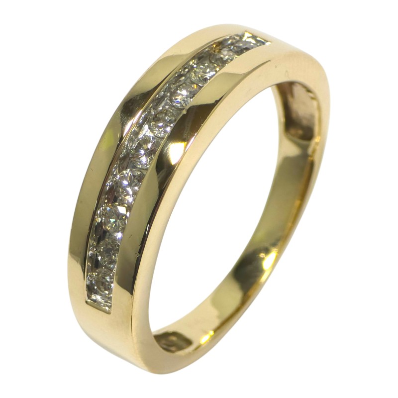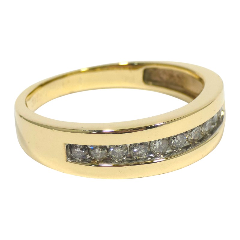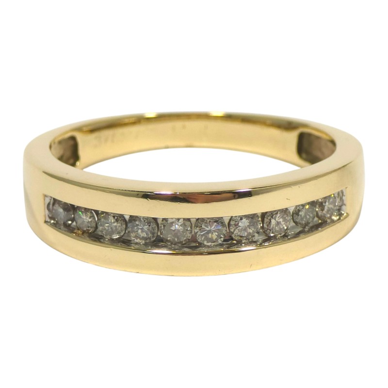 This stunning 9 karat yellow gold ring features a channel-set arrangement of 10 brilliant cut diamonds totalling 0.65 carats, making a classic design that can be worn by all. Crafted with care, this piece exudes timeless elegance.