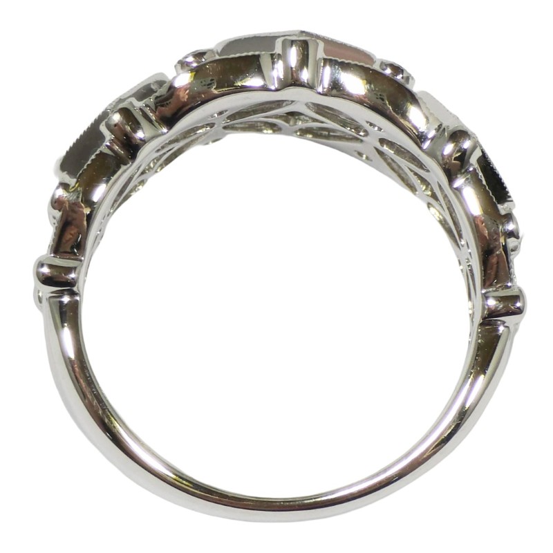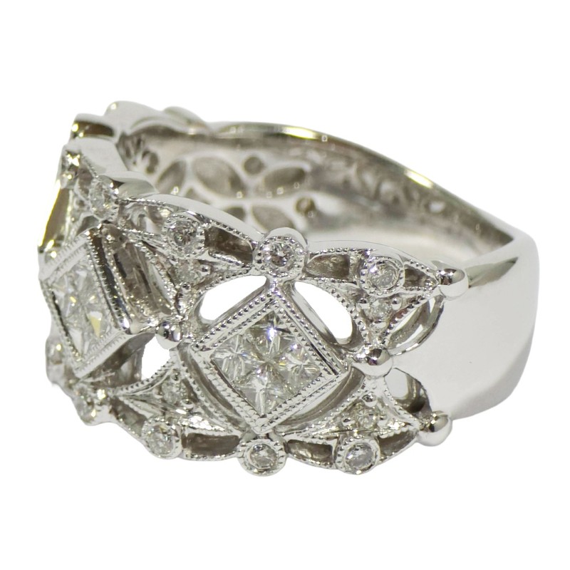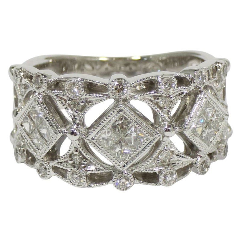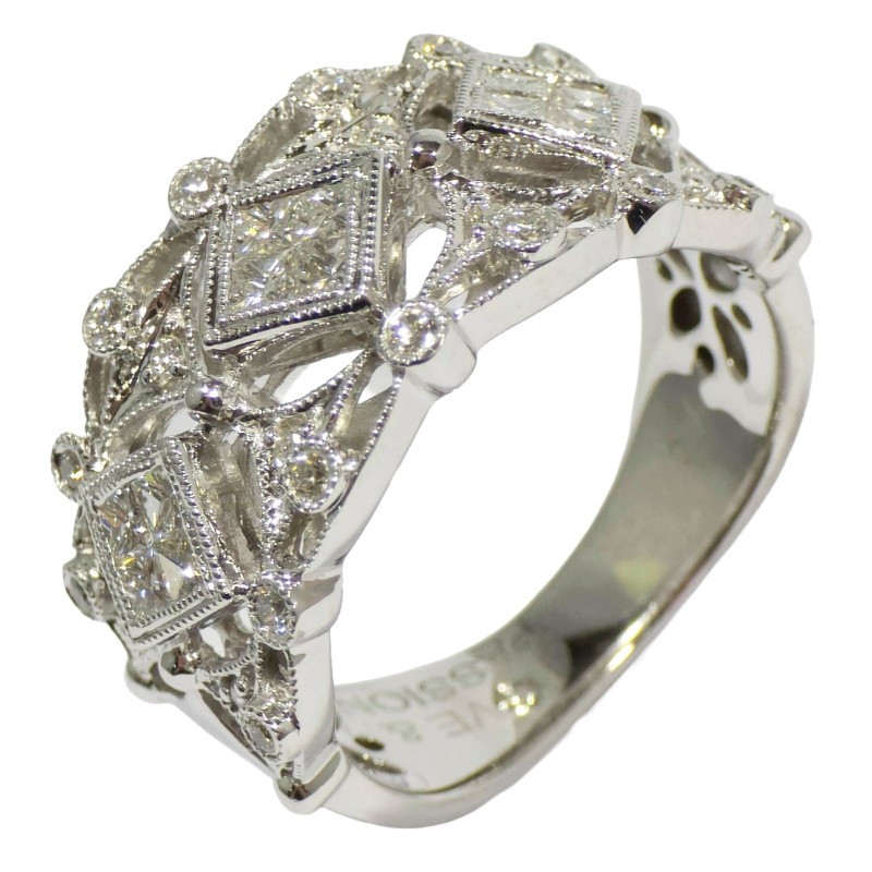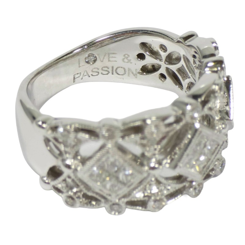 A great gift idea! This eye-catching ring features a decoratively patterned band, set with princess and brilliant cut diamonds. The inside of the band is marked with 'Love& Passion', embellished with a diamond.