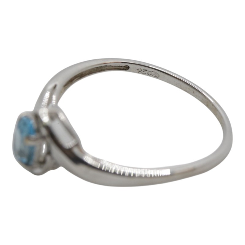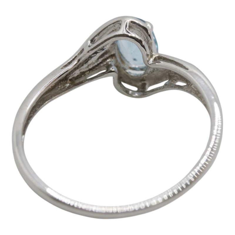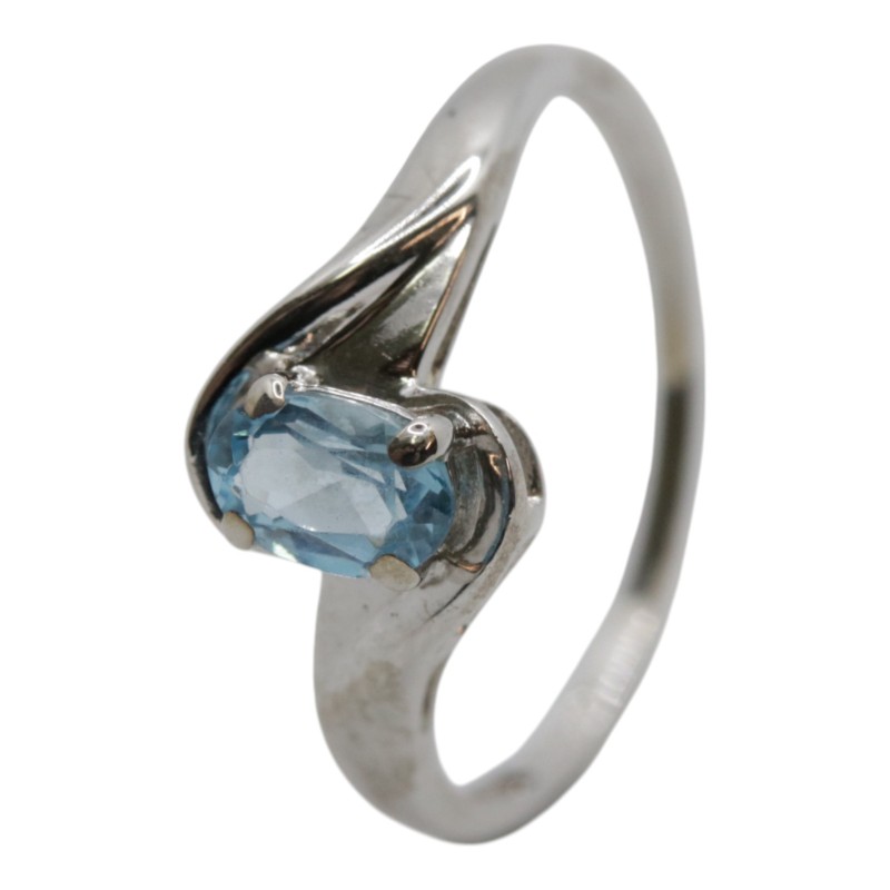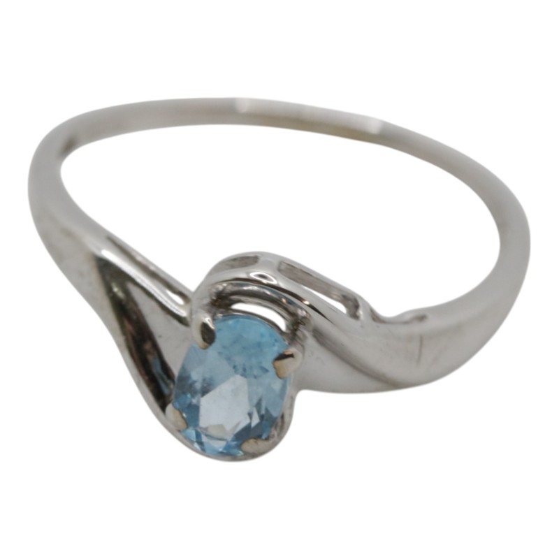 This 9 karat white gold ladies' ring features a captivating blue stone in a classic solitaire setting. The smooth band is hallmarked .375, and the overall weight is 1.49 grams. The stone is securely held in place by claw settings, creating a timeless and elegant look. All sizes and measurements are approximate.