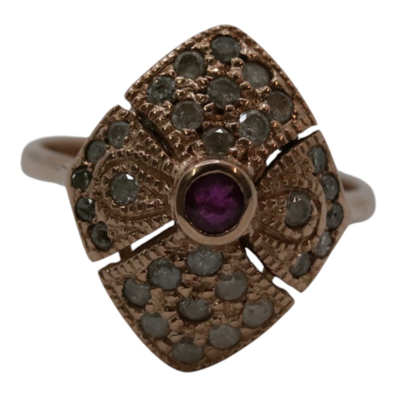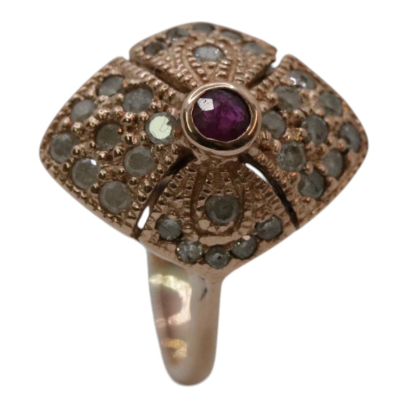 Elegant 9ct rose gold ladies' ring featuring a stunning array of 30 dazzling diamonds and a captivating pink gemstone. The smooth band creates a timeless, sophisticated look. Weighing 3.28 grams, this versatile piece will complement any outfit. All sizes and measurements are approximate.