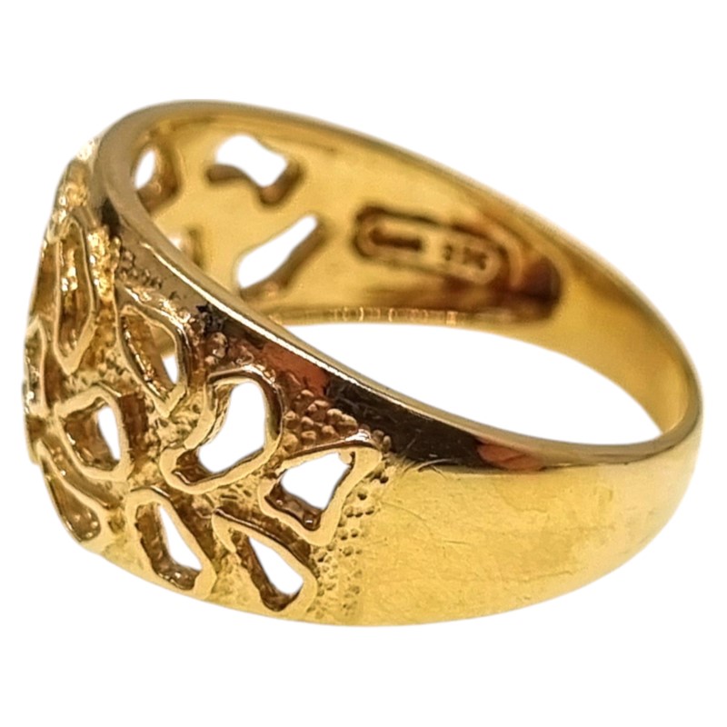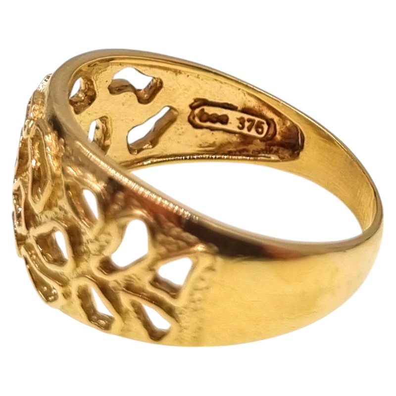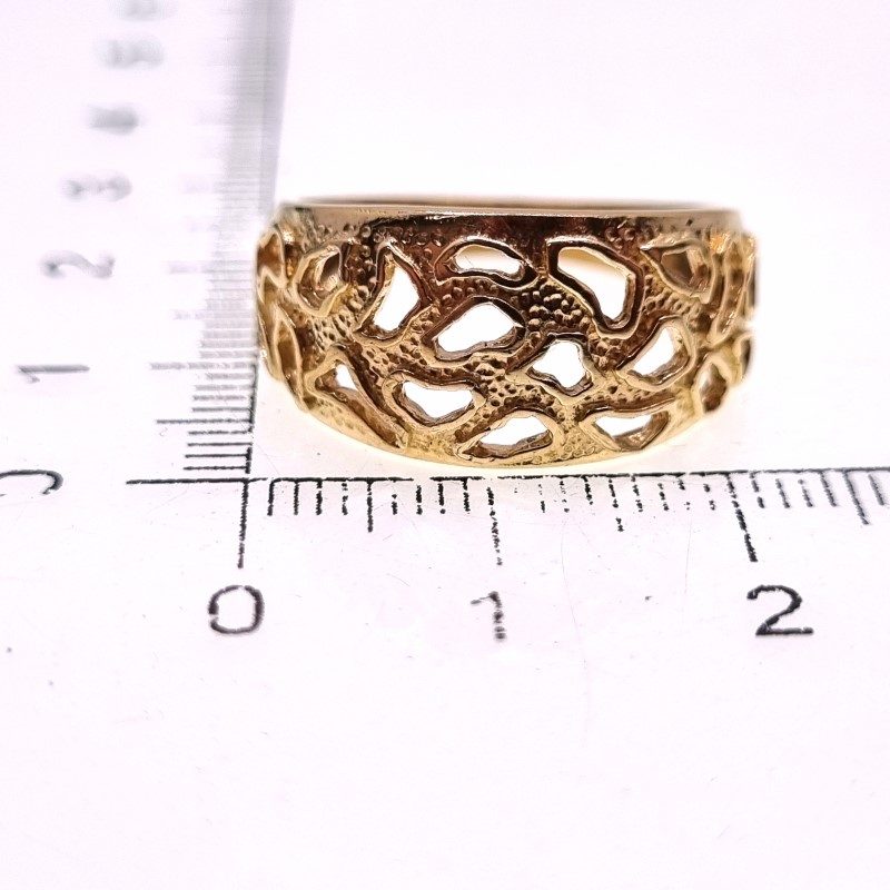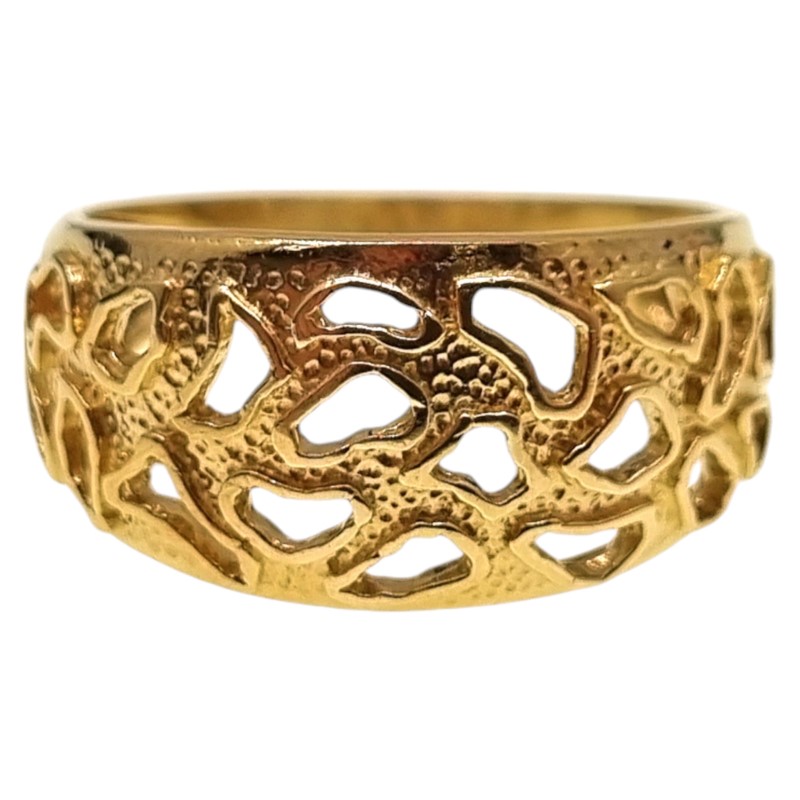 This unique 9ct yellow gold ring features a bold and eye-catching design with intricate cut-out patterns. The wide band adds a statement-making touch, while the intricate detailing creates a visually interesting and textured effect.