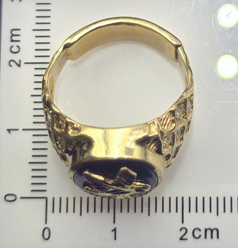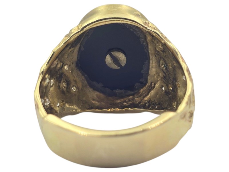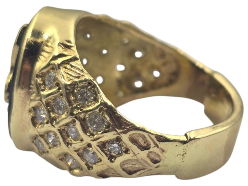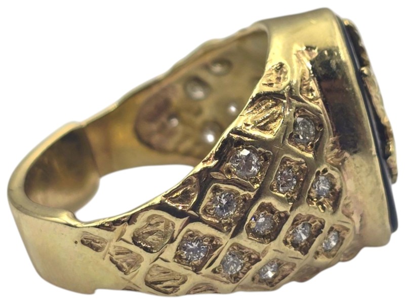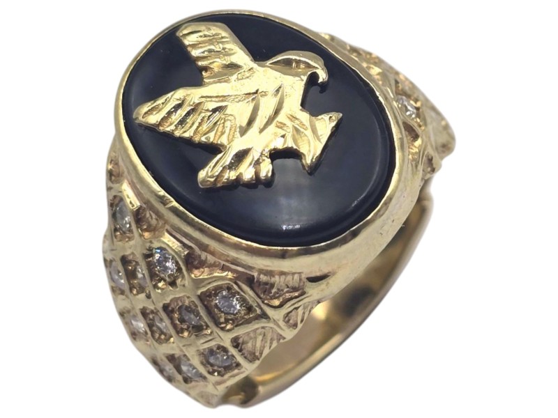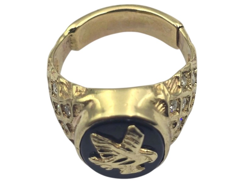 This 9 karat yellow gold ring features a patterned band and a bold eagle design set with a single onyx stone. The bezel setting securely holds the stone in place, creating a bold and eye-catching accessory. Weighing 8.67 grams, this unique men's ring has a ring size of O. All sizes and measurements are approximate.