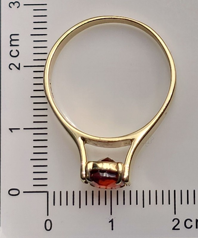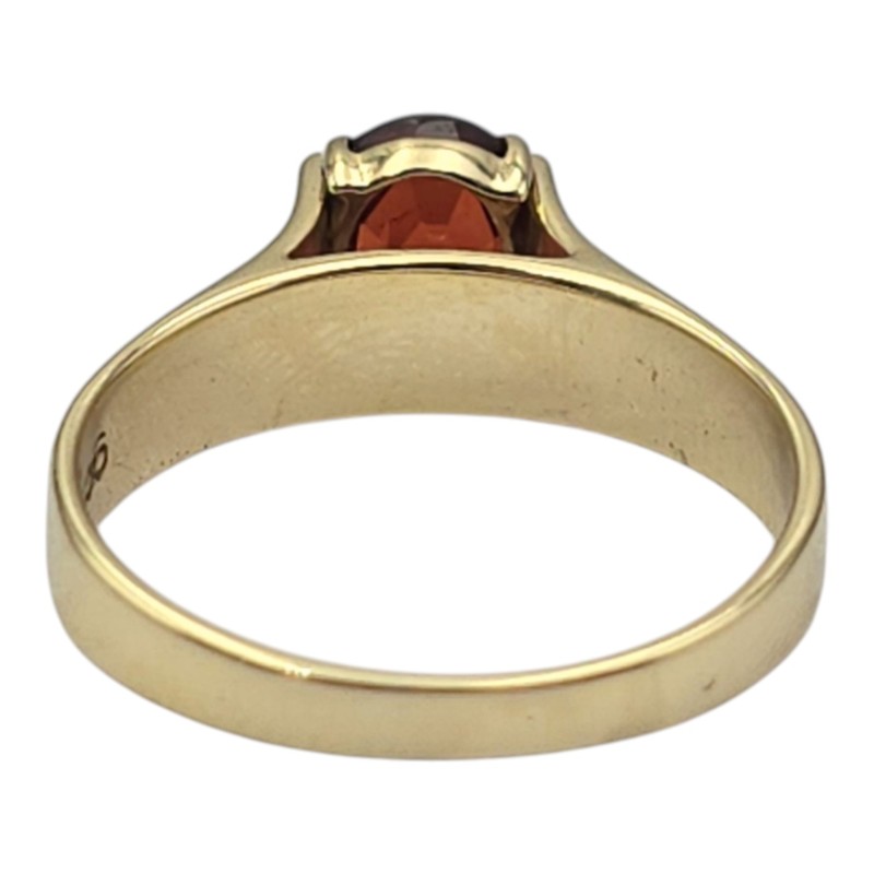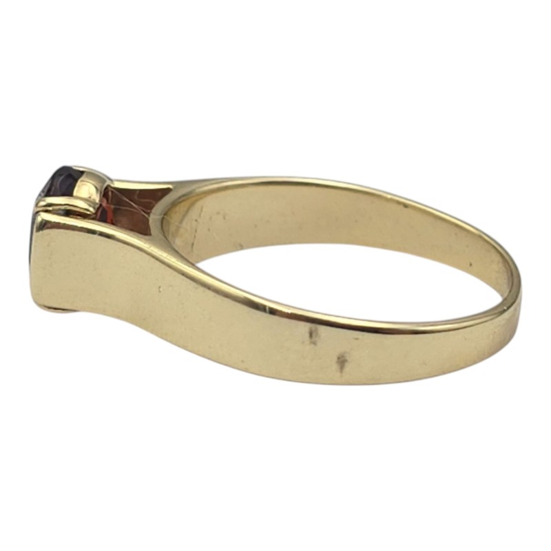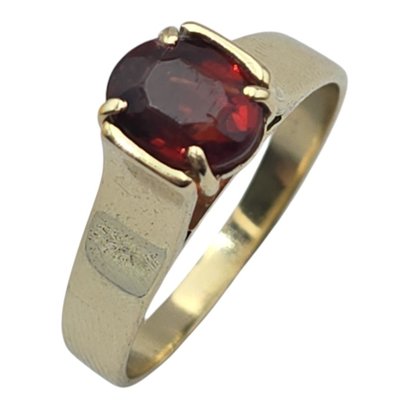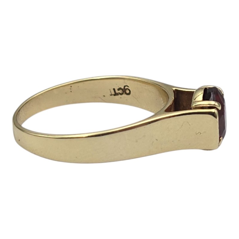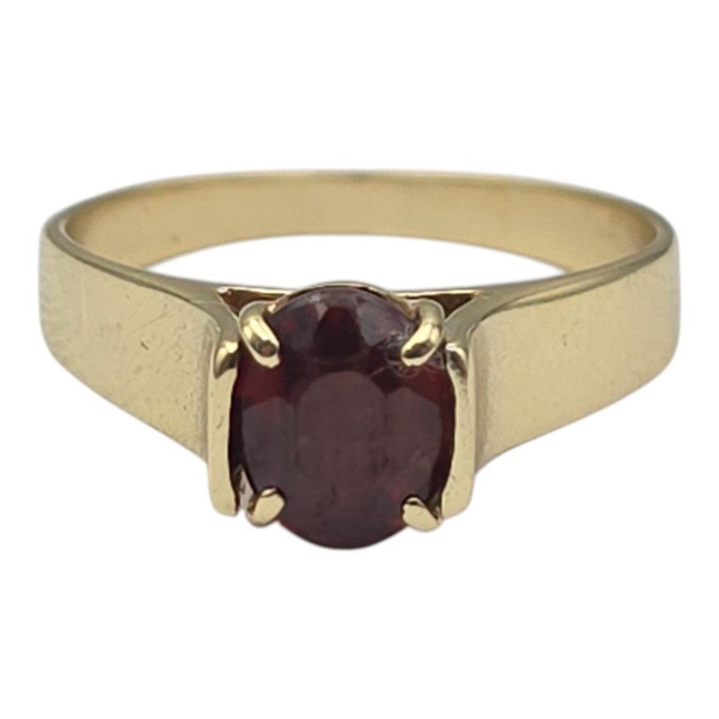 This 9ct yellow gold ring features a vibrant red stone set in a claw setting. The smooth band has a classic unisex style suitable for a variety of occasions. Weighing 3.93 grams, this ring has a hallmark of .375, indicating its 9 karat gold content. All sizes and measurements are approximate.