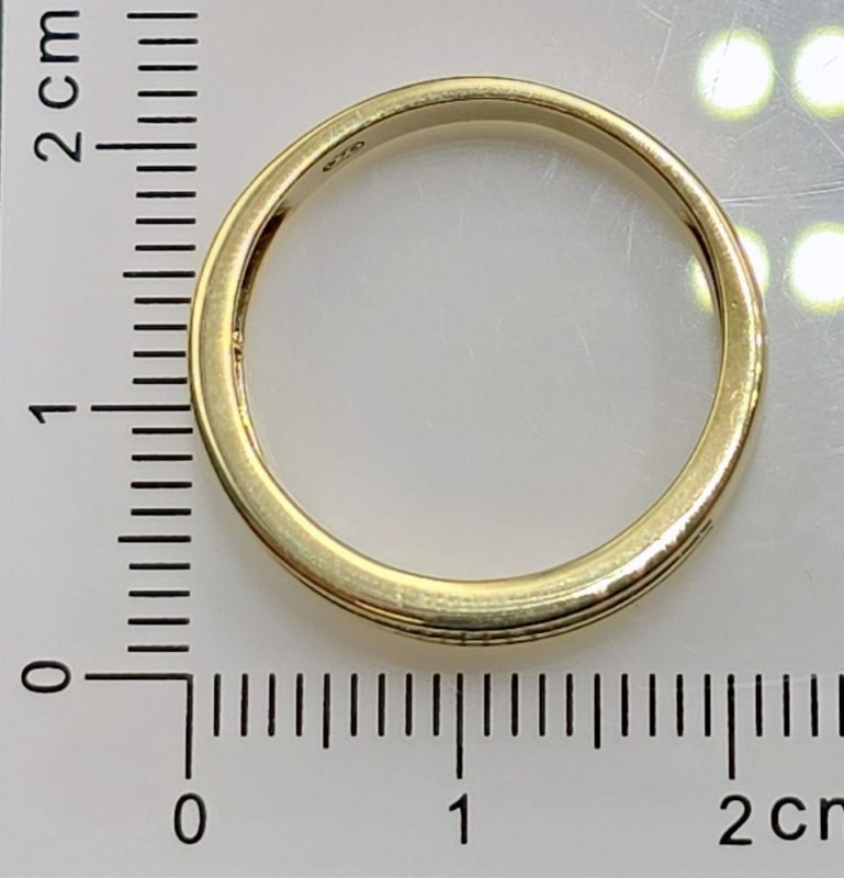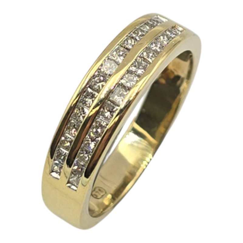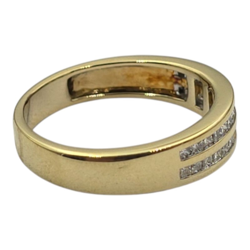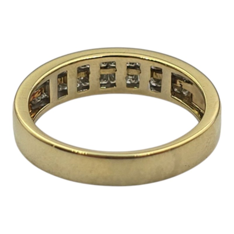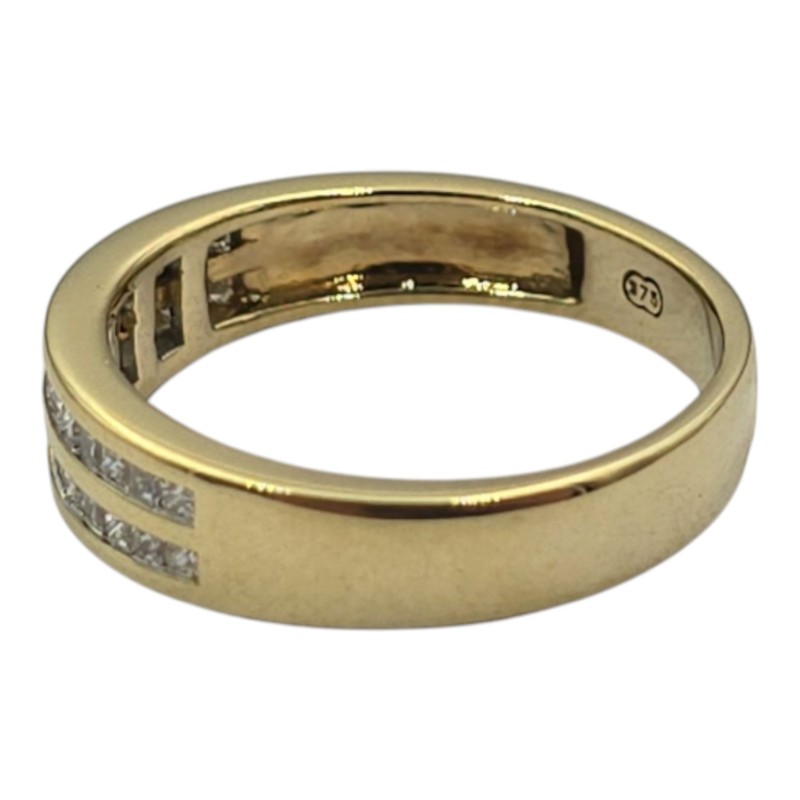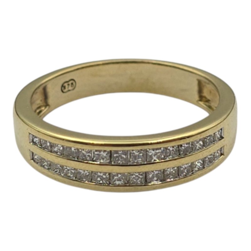 Elegant 9ct yellow gold diamond band. This timeless ladies' ring features a smooth band and a channel setting that securely holds the straight diamond stones. Hallmarked 375, the ring weighs 3.28g and is size O. All sizes and measurements are approximate.