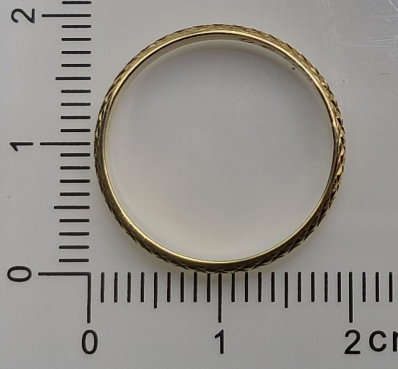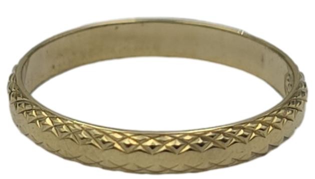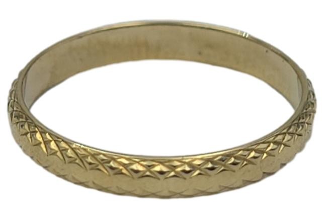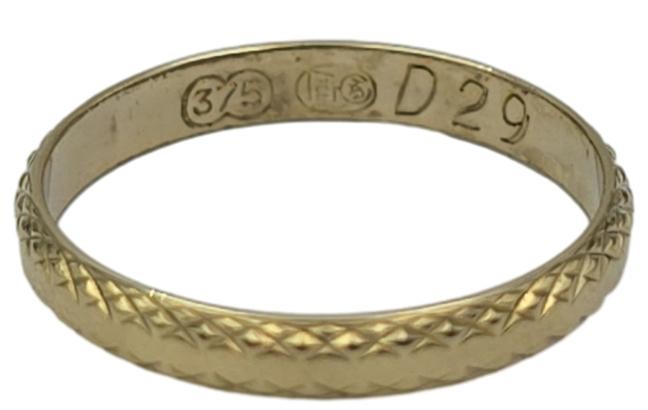 This charming 9 karat yellow gold ring features a patterned band design. The hallmark of .375 indicates a quality 9 karat gold composition. Weighing 1.38 grams, this ladies' ring is size M½. The engraved markings of "375 D29" provide additional detail. All sizes and measurements are approximate.