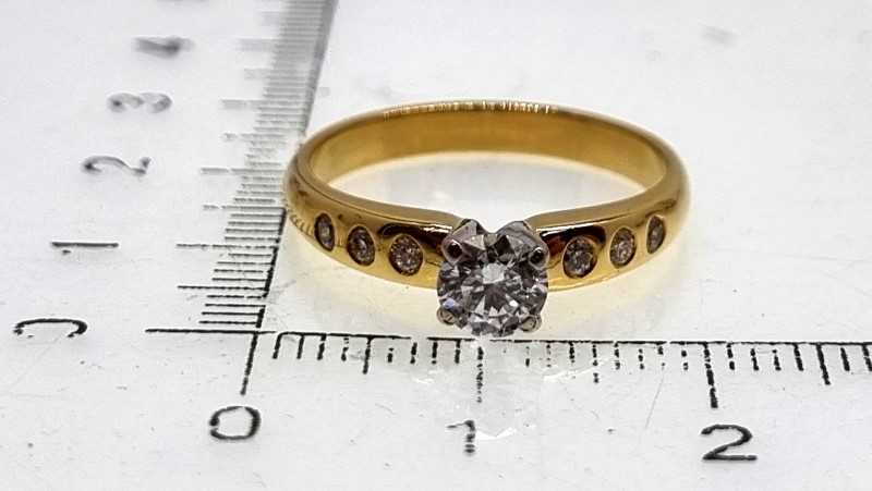 This exquisite ladies diamond ring is a timeless symbol of elegance and sophistication. Crafted from luxurious 18ct yellow and white gold, the ring features a slightly rounded shank with raised shoulders, ensuring a comfortable and secure fit. Weighing a total of 3.60 grams, the ring is marked with a shield symbol and "18CT," signifying its premium quality and exceptional craftsmanship.