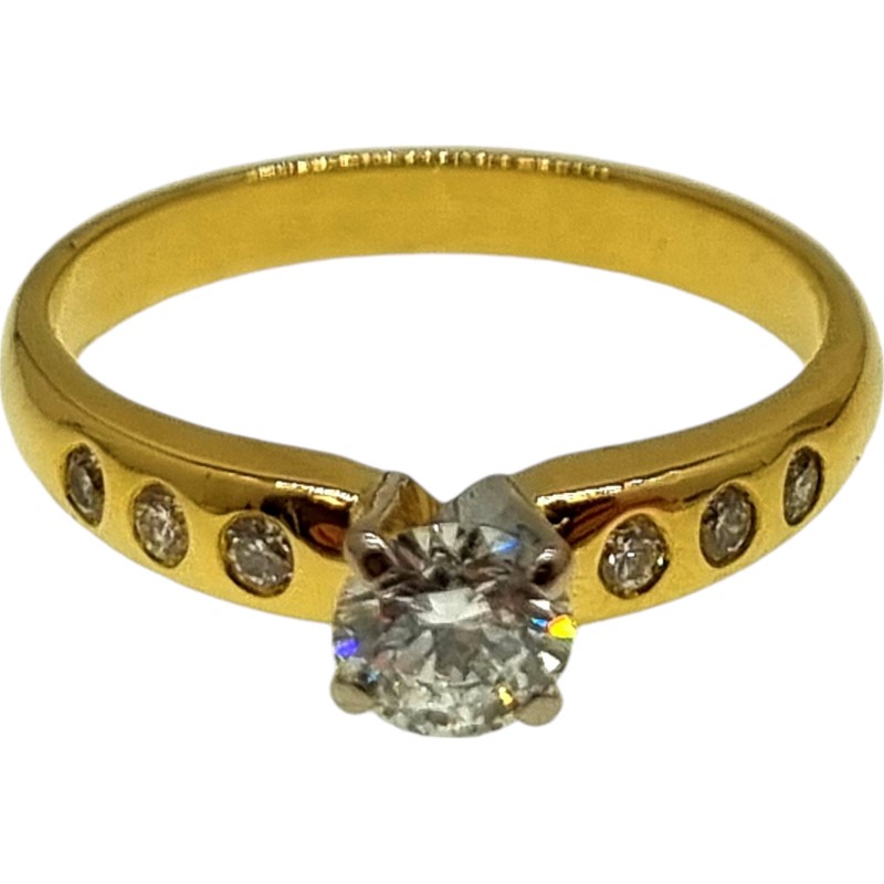 Adding to the ring's allure are six round brilliant cut natural diamonds, flush set in 18ct yellow gold along the shoulders. Each of these diamonds measures 2.00mm in diameter and approximately 1.22mm in depth, contributing to a total additional weight of 0.180 carats. These smaller diamonds, graded H-I in colour and VS2-SI1 in clarity, add a layer of sparkle and sophistication.