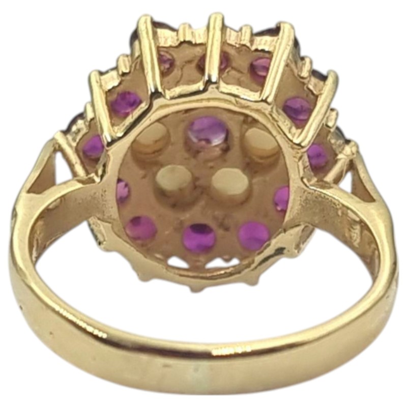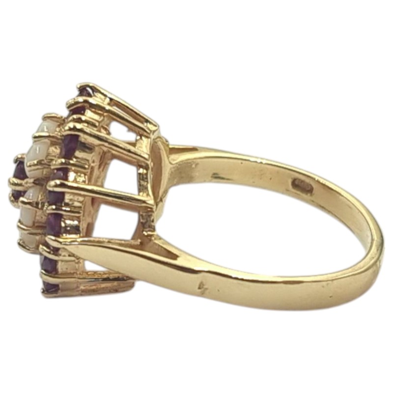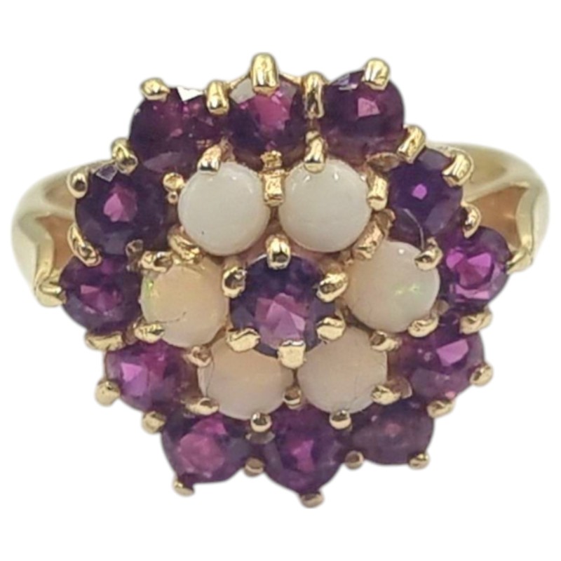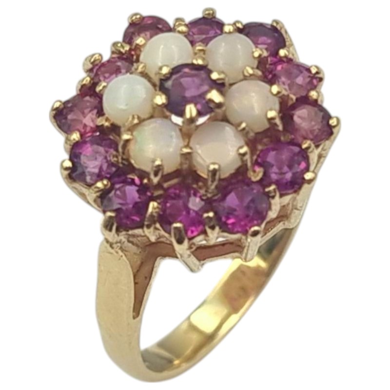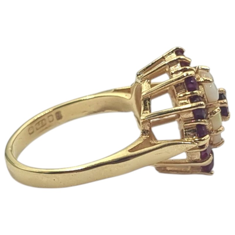 One cast polished 9 carat yellow gold ruby and white opal cluster ring with a slightly rounded shank and raised open shoulders topped with a stepped cluster setting. The ring is a size L 1/2 and weighs a total of 4.70 grams. Stamped "375" with a "RJ" maker's mark that can also be found on the item. Stamps also indicate that the item was hallmarked by the London Assay Office in 1976. The ring is in very good condition.