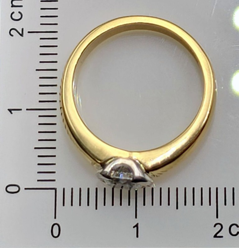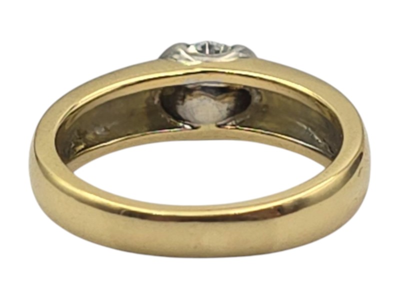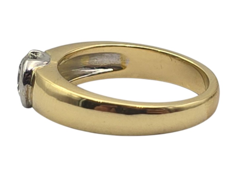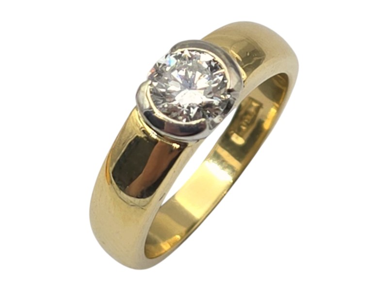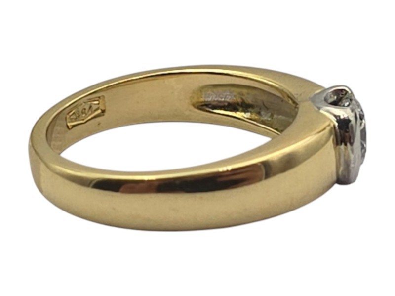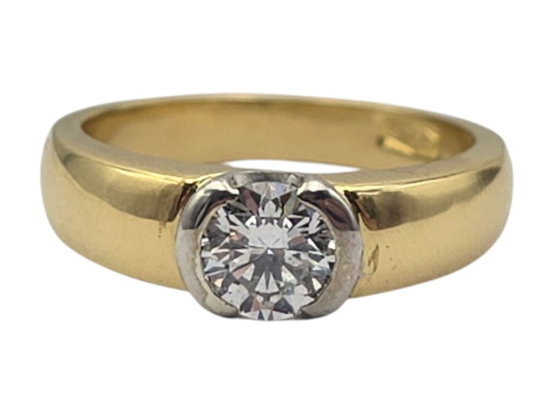 One cast & assembled polished 18 carat yellow gold and 9 carat white gold diamond solitaire ring with a slightly rounded shank and straight shoulders with a white gold and rhodium plated half bezel setting at the top. The ring is a size K and weighs a total of 5.60 grams. Stamped "750". In very good condition.