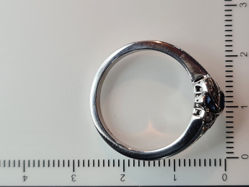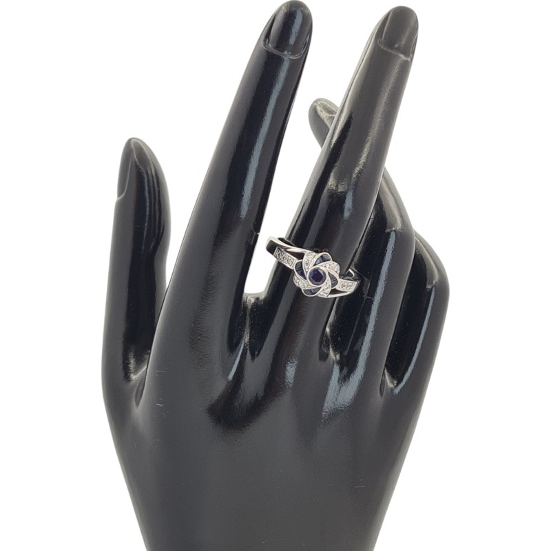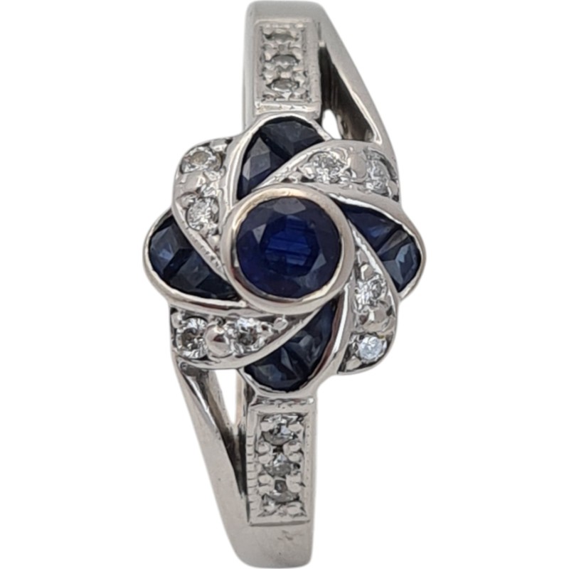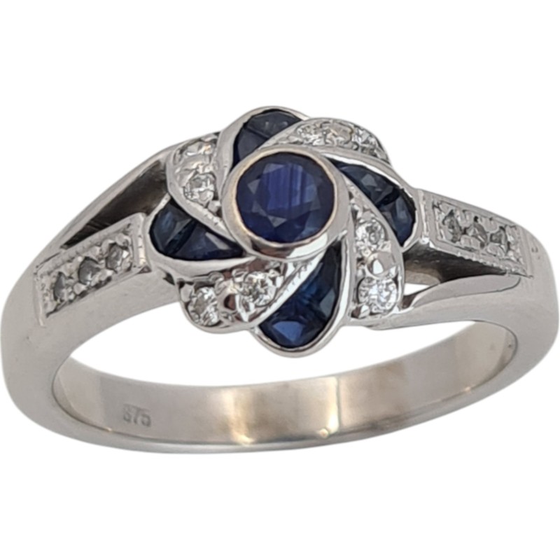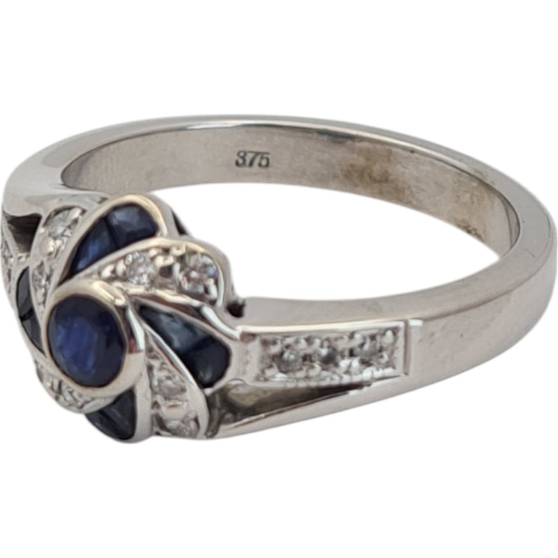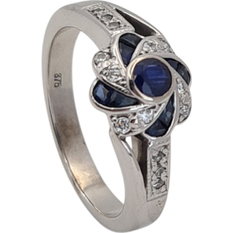 This elegant 9 Karat white gold ring features a cluster of 5 sparkling blue sapphires totalling 0.3 carats in a round brilliant cut. The hallmark of .375 indicates the precious metal content, while the smooth band style and size R½ make this a sophisticated ladies' accessory. The total diamond weight of 0.21 carats adds further brilliance. All sizes and measurements are approximate