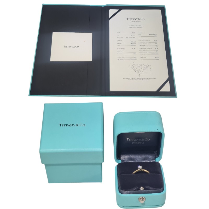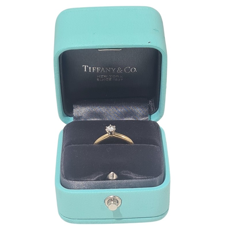 This exquisite 18k yellow gold ring from Tiffany & Co. features a stunning 0.18ct princess-cut diamond with VVS1 clarity and I colour grade. The smooth band and classic claw setting showcase the hero stone's brilliant sparkle. Hallmarked .750, this timeless ladies' diamond ring is engraved with the Tiffany & Co. Au750 Pt950 stamp, ensuring its quality and provenance. All sizes and measurements are approximate.