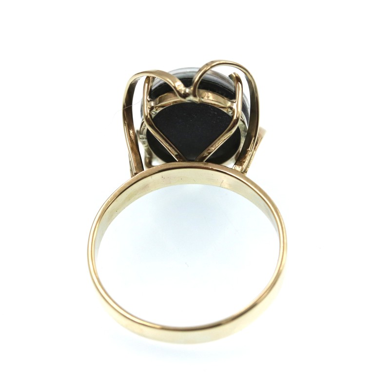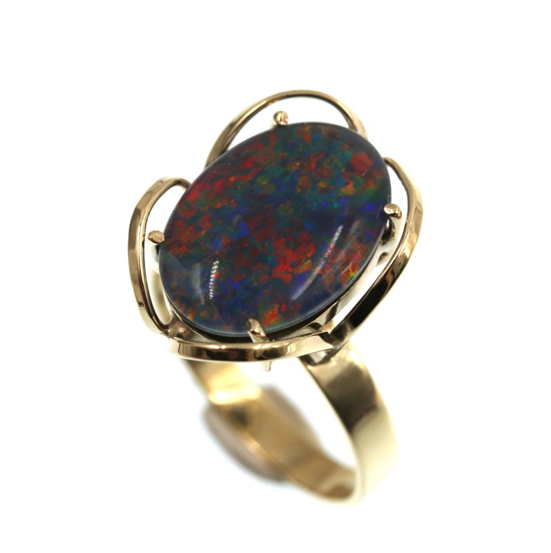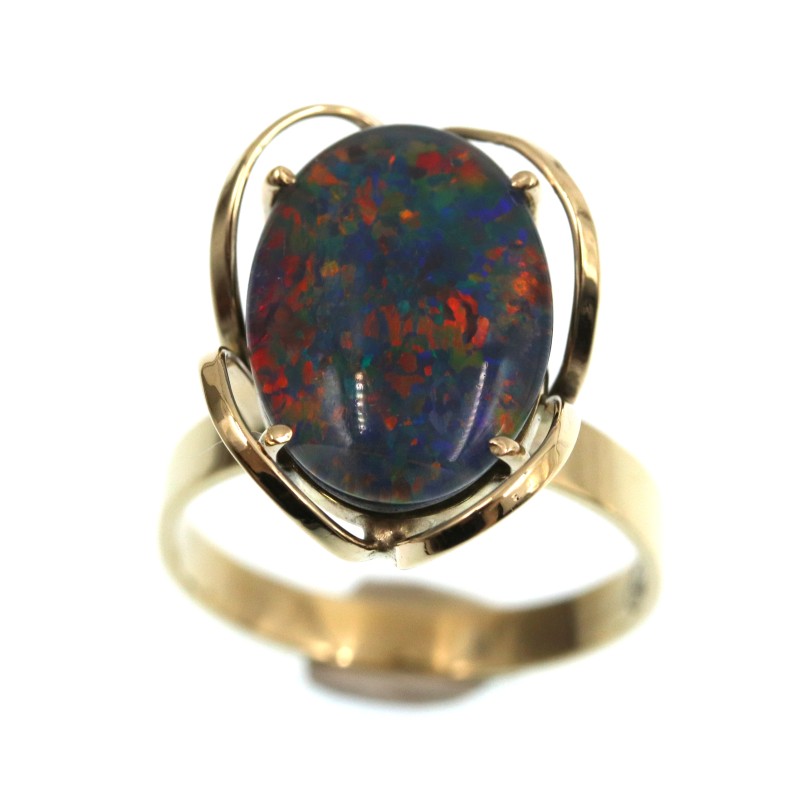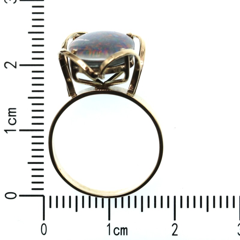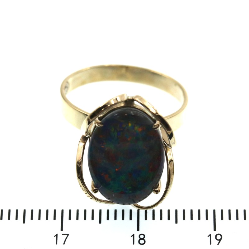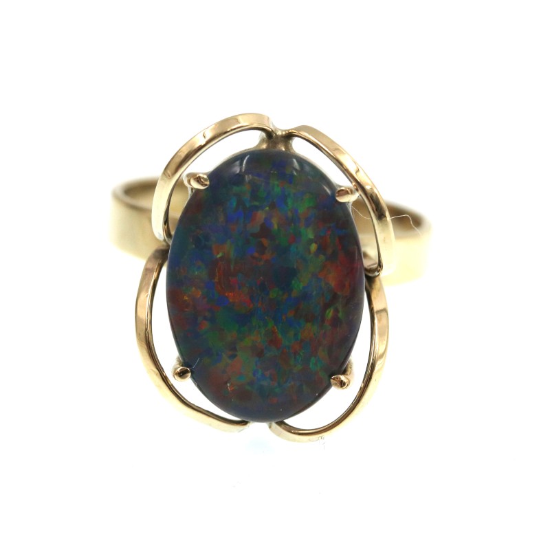 This striking 9ct yellow gold ring features a beautiful semi-precious opal as the hero stone. The opal, a unique natural gemstone, is set in a classic ring design. Weighing approximately 2.75 grams, this ring has a hallmark of .375, indicating the purity of the gold. With a ring size of K, this piece is a versatile accessory that can be enjoyed for years to come. All sizes and measurements are approximate.